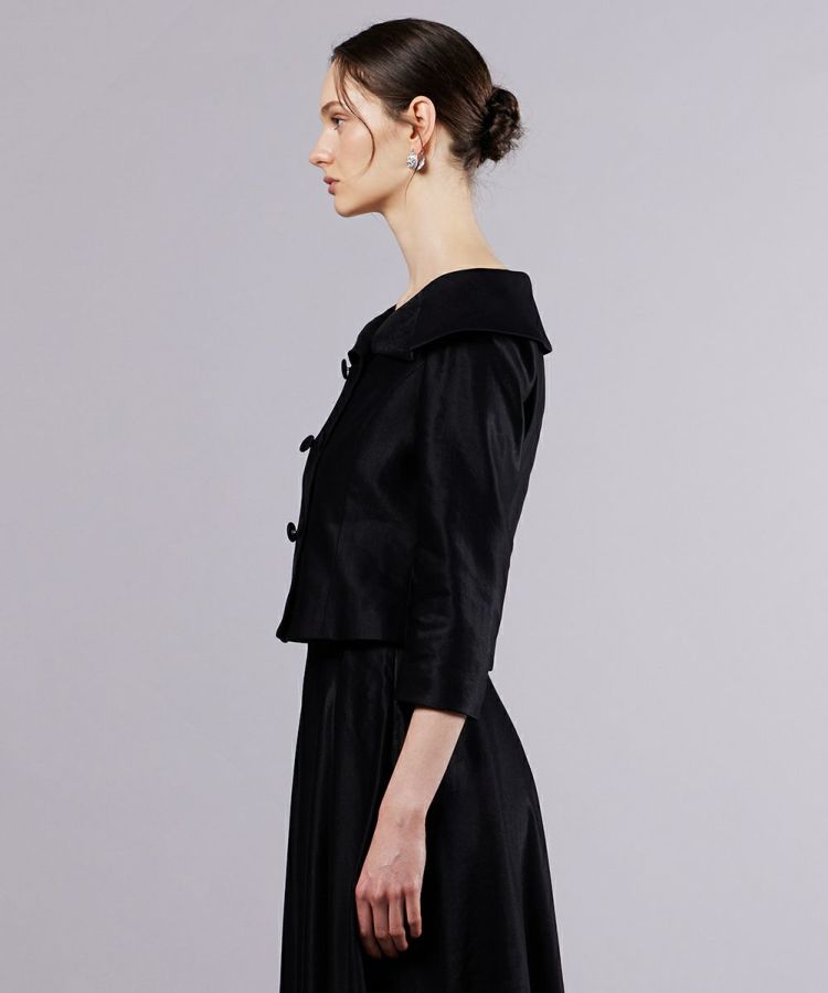 デコルテを美しく引き立てる、オフショルデザインのダブルボタンジャケット。イタリアメーカーと共同開発したオリジナル素材を使用し、麻のナチュラルな表情とレーヨン特有の美しい落ち感が魅力です。タイトなシルエットが女性らしさを引き立て、洗練された印象に。同素材のスカート(型番:0302231253)と合わせれば、ジャケットワンピースのような着こなしも楽しめます。