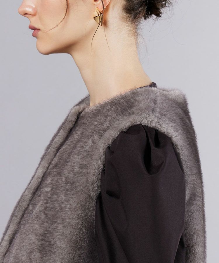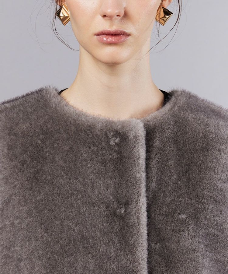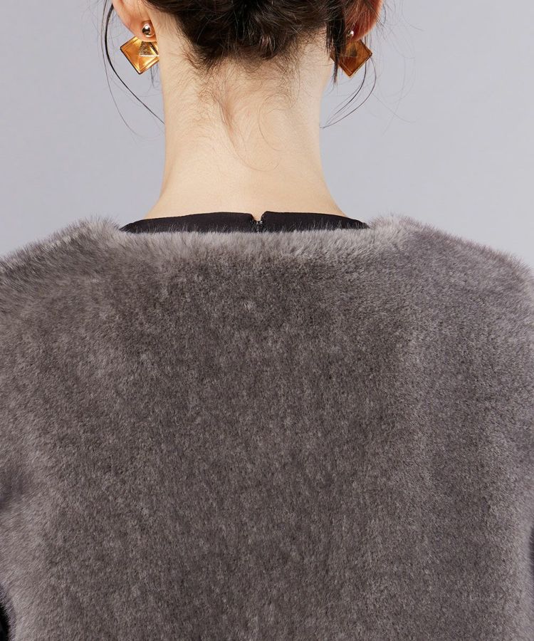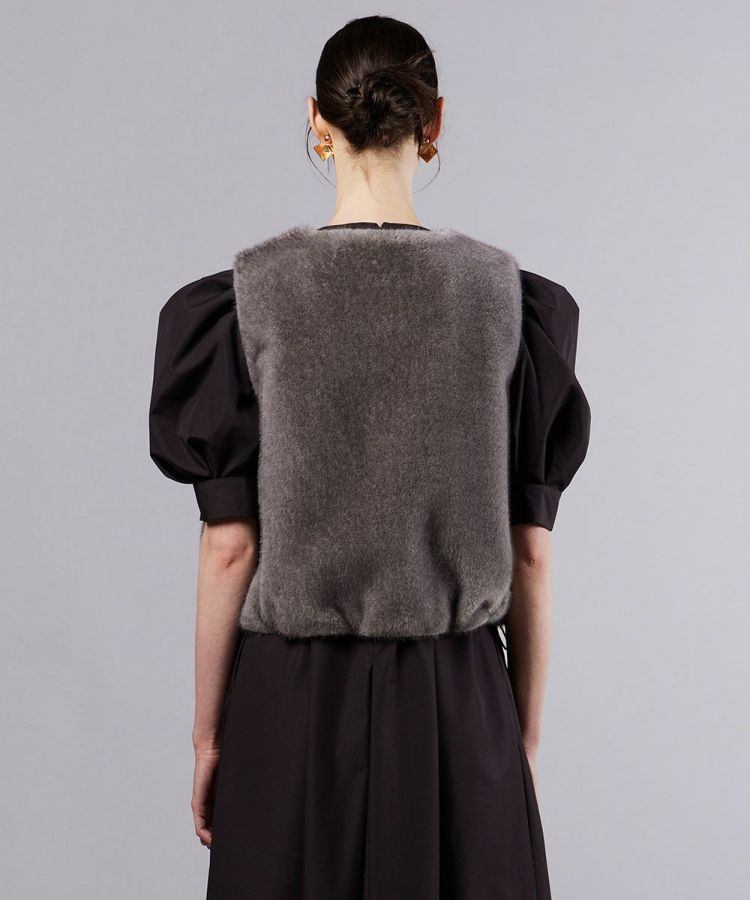 上品な光沢をまとった、高級感漂うファーベスト。ポリエステルファーを丁寧にトリミングし、毛先には差し毛カラーを入れたことで、本物のミンクのような立体感と風合いを再現しました。リュクス感がありながらも軽やかで快適な着心地をキープ。シンプルなカットソーやニットの上から羽織るだけで、エレガントな装いが完成します。