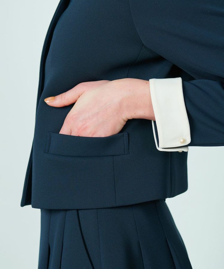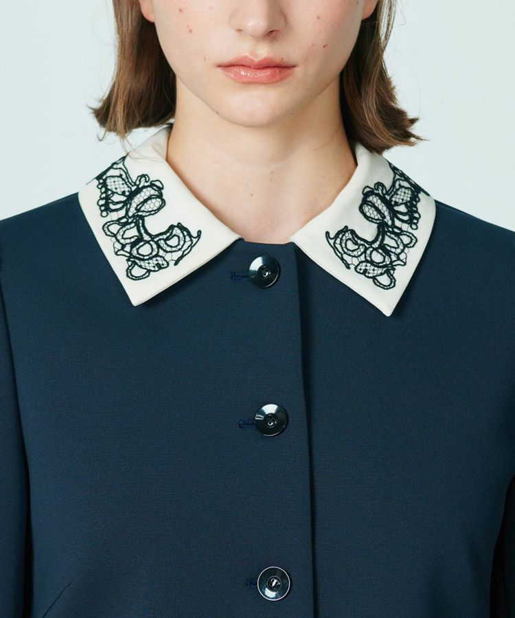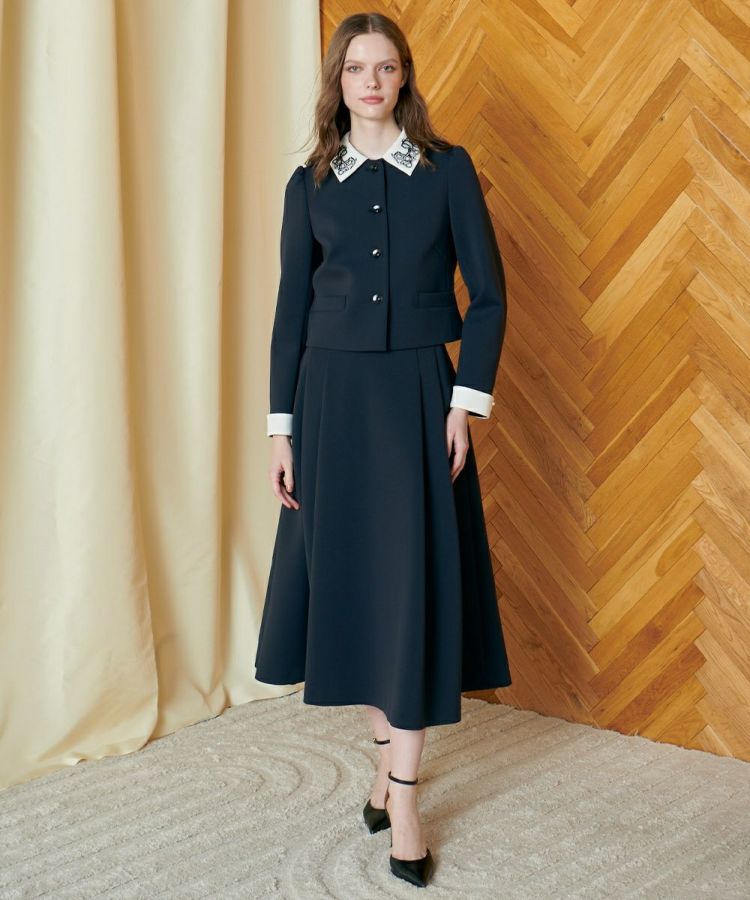 なめらかな表面感が美しいジャケット。刺繍入り襟や袖口のパールなど、上品でクラシカルな雰囲気に仕上げました。コンパクトなフォルムなので、全身のコーディネートバランスを取りやすいのもポイント。襟は取り外してノーカラージャケットとしても使えるため、オケージョンから普段のお出かけまでさまざまなシーンで楽しめます。
