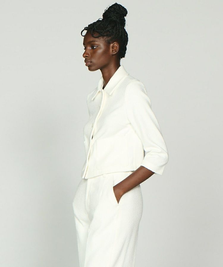 リング糸を使った表情豊かなコットンツイード。ショート丈でモードに着こなせ、上質さの中にあるナチュラルな風合いが好印象。