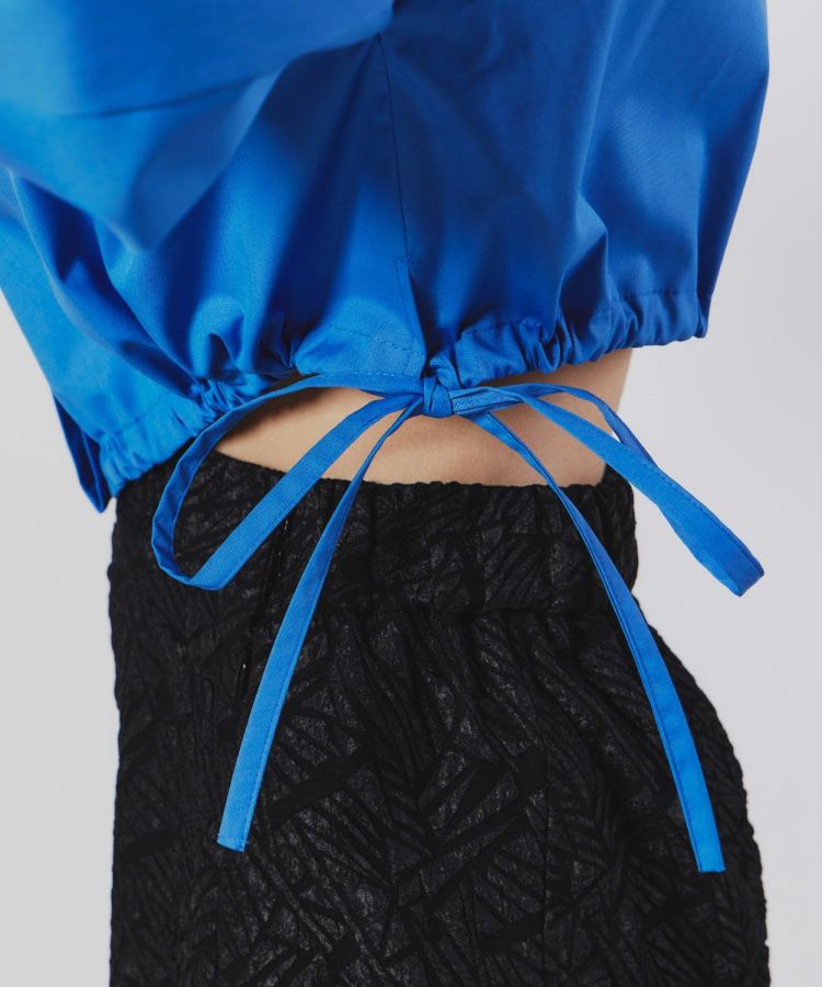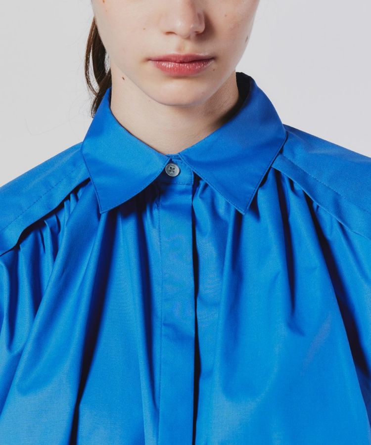 パリッとハンサムな印象を与える、ショート丈のブラウス。フロント、バック、スリーブにもたっぷりとギャザーを寄せ華やかさをプラスしました。また、大胆なショート丈にすることで、コーディネートがぐんとモードに。どんなボトムを合わせても全身がスタイルよく決まるのも魅力です。袖先をやや眺めに設定したり、裾をリボン仕様にするなど、さりげない甘さを潜ませているのもポイント。