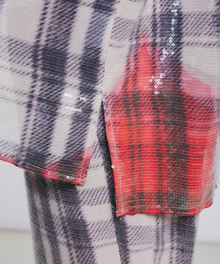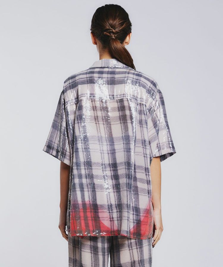 ペイント加工を施したネルシャツのような模様を、全面スパンコールで表現した贅沢なシャツ。ラフなシルエットながらも、スパンコールの輝きが唯一無二の存在感を放ちます。裾に赤いペイント加工風をあしらいアクセントに。同素材のパンツ(型番0306541241)とセットアップで着こなして欲しいアイテムです。