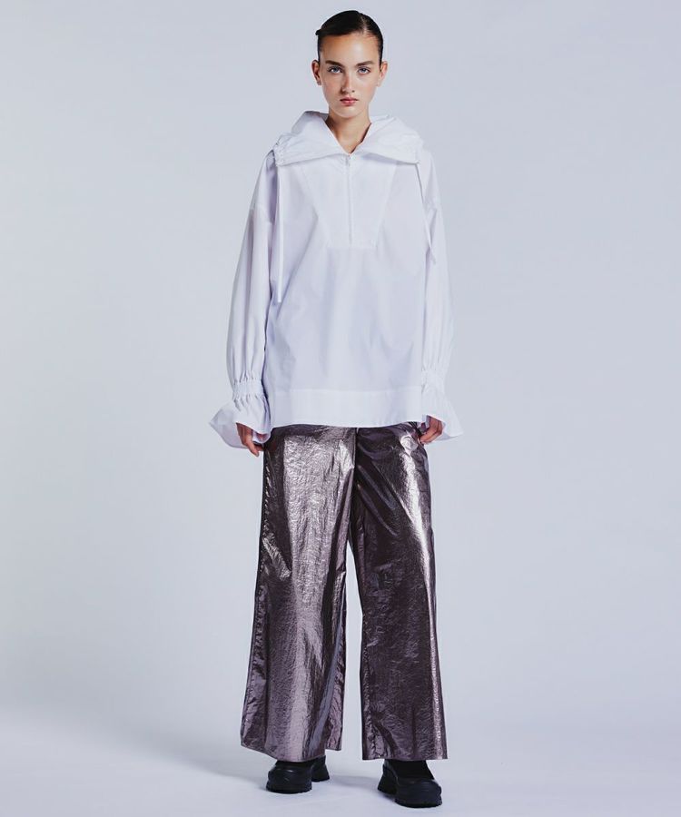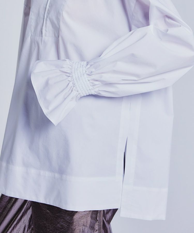 パリッとした質感が爽やかなタイプライター生地を使用したトップス。フードが襟になり、シンプルな中にアクセントを加えています。手元をきれいに見せてくれる、絞りを効かせた袖先もポイント。チュニック丈なのでウエストやヒップラインを自然にカバーしてくれるのもうれしいポイント。春先まで使える一枚です。