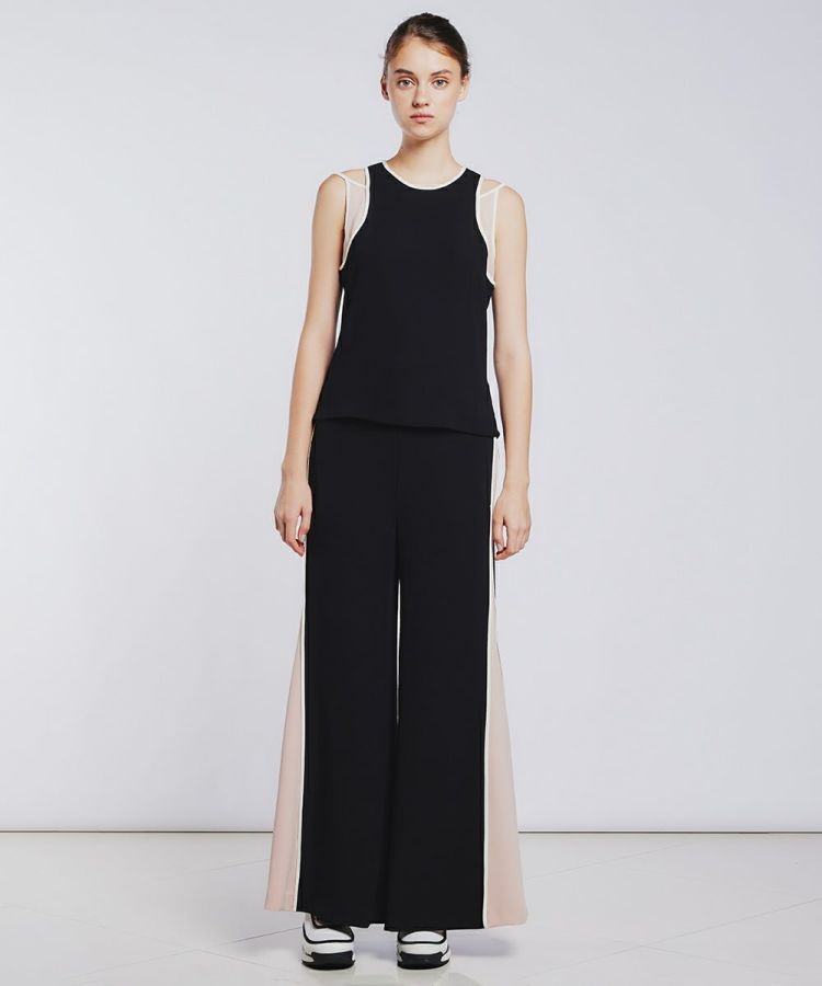 メインになるブラックの生地と、柔らかなピンク色の生地がレイヤードになったトップス。シンプルになりがちな春夏のコーディネートにひとつプラスするだけで、ぐんとこなれ感が出る優れものです。脇のラインを自然にカバーしてくれるのもうれしいポイント。ラインのデザインがさりげなくスポーティーな印象を与え、カジュアルなアイテムとも好相性です。同素材のボトムとセットアップを楽しむのもおすすめ。