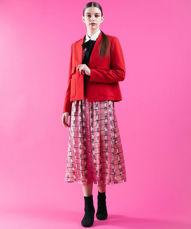 ポリエステルでありながらウールのような膨らみと程よいハリ感のあるジャケット。ノーカラー仕様のすっきりとしたショート丈で、カーディガンのように気軽に羽織れるのが魅力です。品のあるなめらかな質感とドレープ感に加え、カジュアルなコーディネートにも合わせられる独特の表面感もポイント。暗くなりがちな秋冬のコーディネートの差し色にぴったりで、シャツとの相性も抜群です。