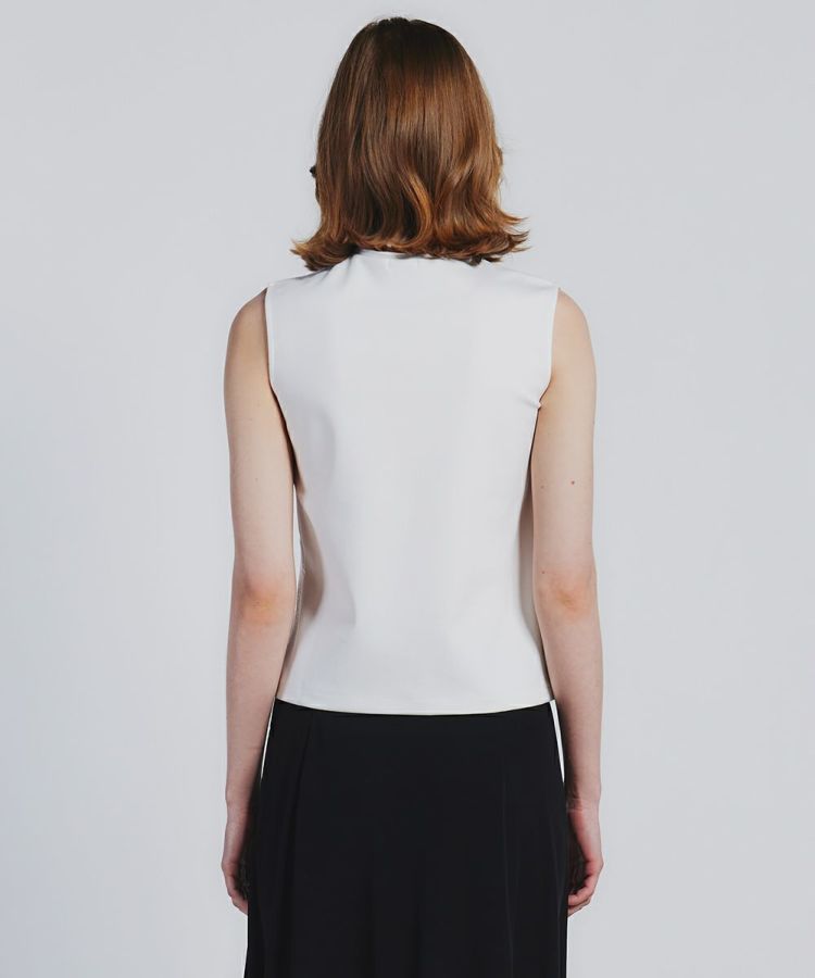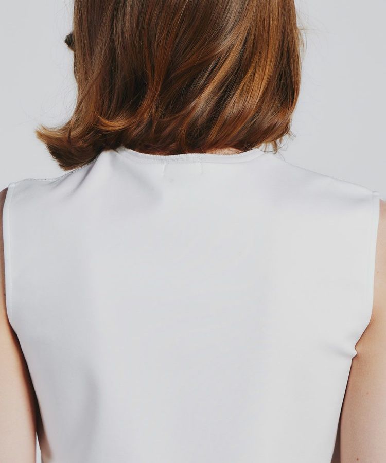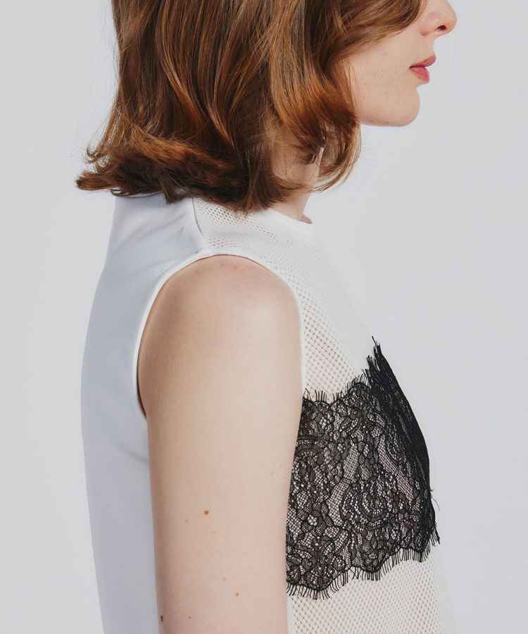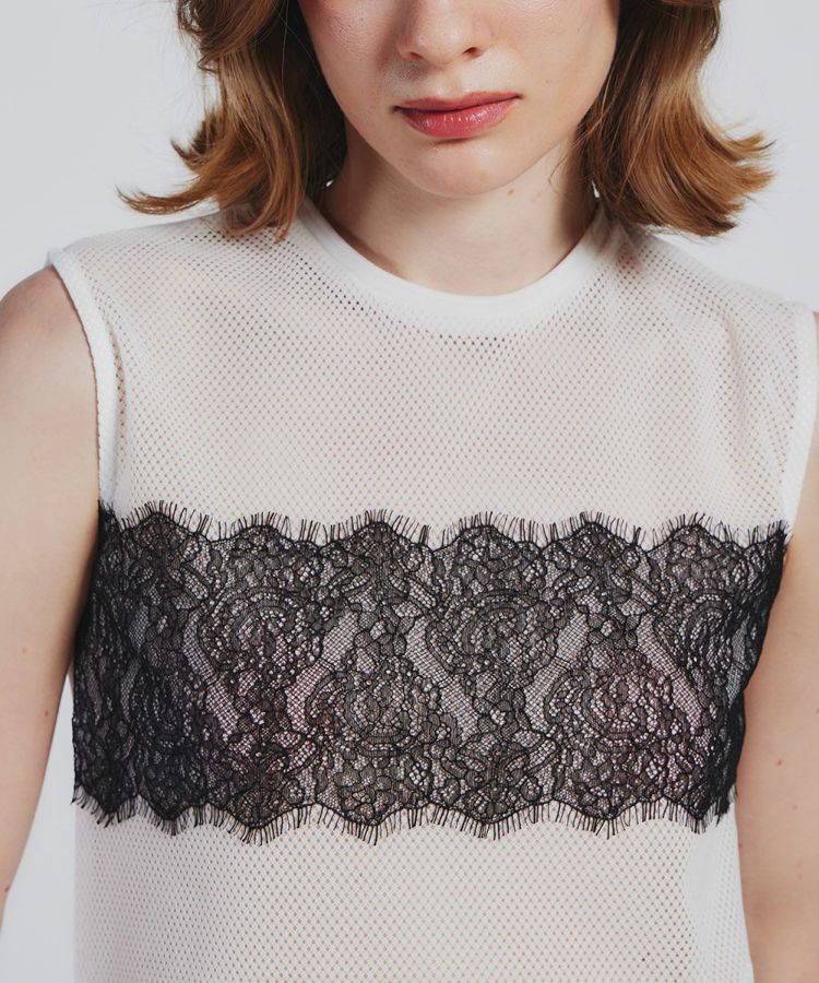 前身頃に透け感のある素材をドッキングした、涼しげなタンクトップ。胸元には繊細なレースをあしらい、フェミニンなアクセントを効かせました。モノトーンの配色で、コーディネートに取り入れやすい一方、甘くなりすぎず辛口に着られるのが魅力的。スカートに合わせると、コーディネートを大人っぽく引き締めてくれます。