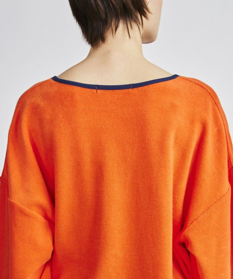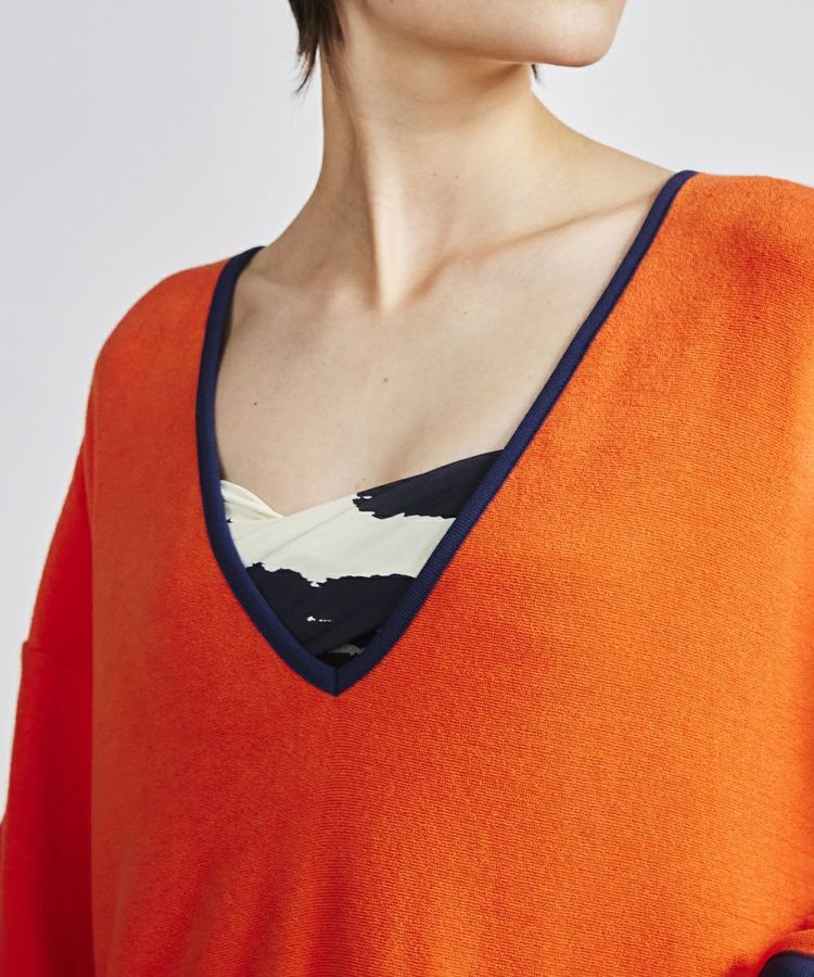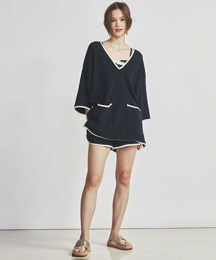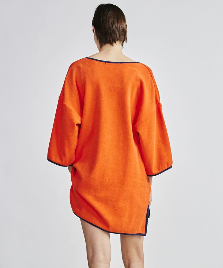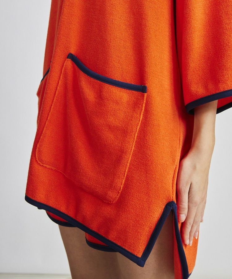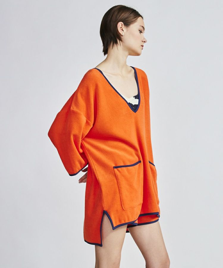 スイムウエアのウエアから羽織れるタオル生地のチュニック丈ガウン。大きめに開いたネックがデコルテラインをきれいに演出します。また、襟や袖、裾、ポケットにあしらった配色のパイピングがアクセントに。ゆったりとリラクシンな印象を与えながらも、エッジのあるデザインが魅力的です。