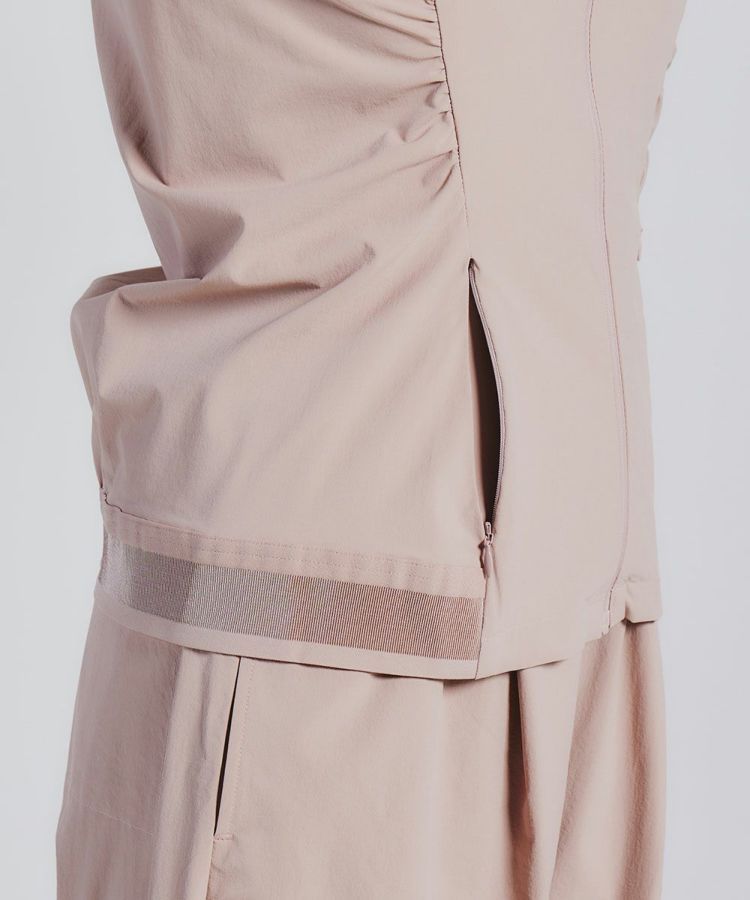 シャカシャカとした素材が涼しげでスポーティーな印象を与えるジップアップパーカー。ストレッチ性に優れているため、デイリースタイルはもちろん、アクティブシーンでも活躍します。サイドやバックの絞りデザインがポイントになり、シルエットをきれいに演出してくれるのが魅力的。胸元やバックにあしらったロゴもアクセントになっています。