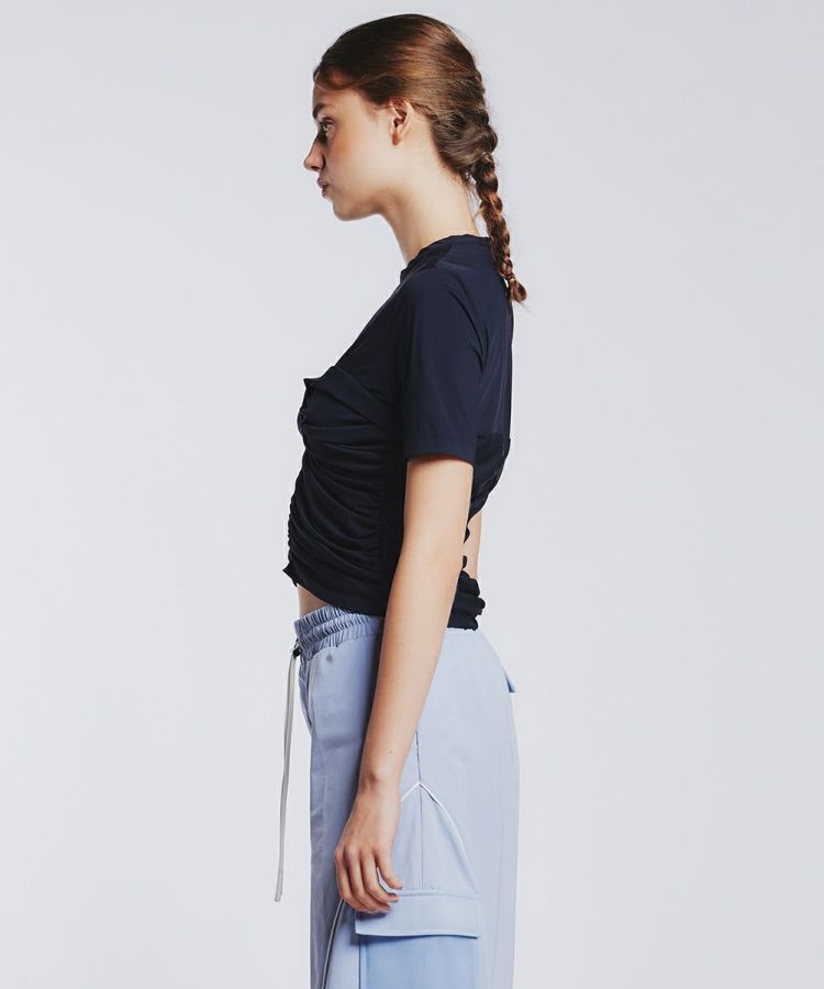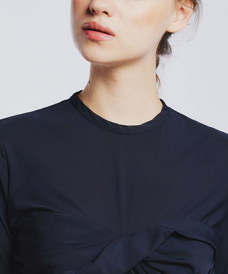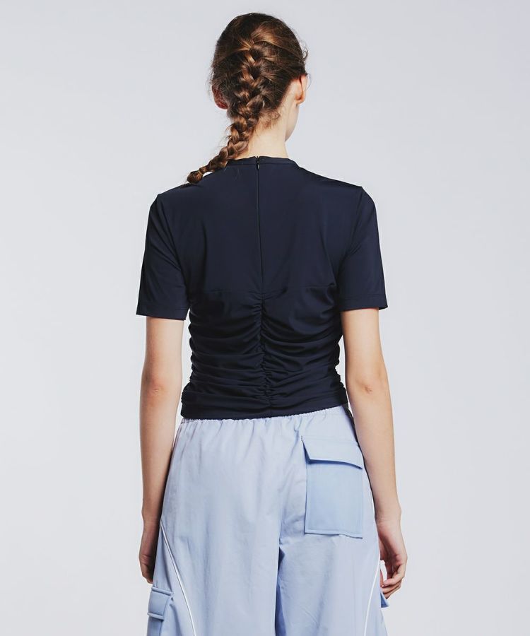 コルセットのようなデザインがさりげないモード感を醸し出すプルオーバー。千鳥ステッチで寄せたギャザーがポイントで、今シーズンらしく仕上げました。薄く軽やかな素材は適度なストレッチ性があり、心地よい肌触り。また、接触冷感や紫外線防止機能も兼ね備えています。シンプルでありながら、品良く着映えのする一枚。合わせるボトムを選ばず、春夏のワードローブに加えておくと重宝するアイテムです。