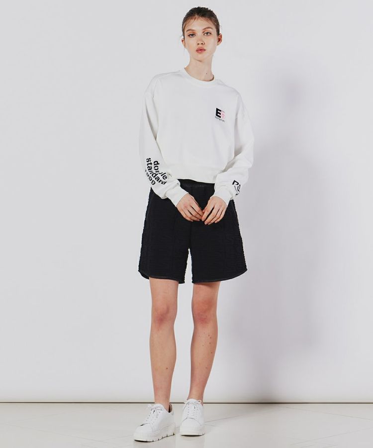 薄手のダンボール素材を使用したプルオーバー。マットな質感や、サイドにあしらった同色のリブが上品で大人っぽい印象を与えます。軽量でストレッチ性があり、着心地の良さは抜群。紫外線カット機能や型崩れにしくく、シワになりにくいなど、機能性に富んでいるのもポイントです。左胸の浮き上がり刺繍と、両袖にあしらったプリントがアクセントになっています。