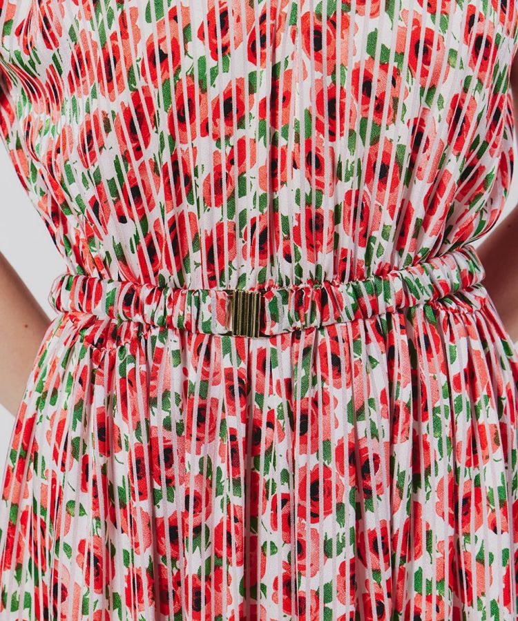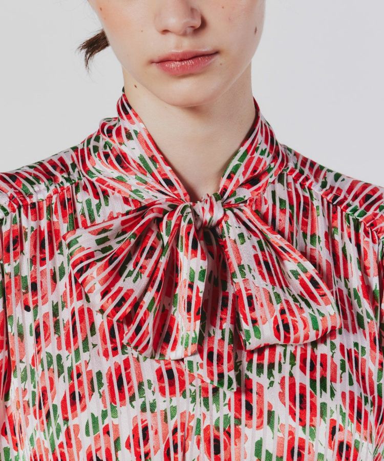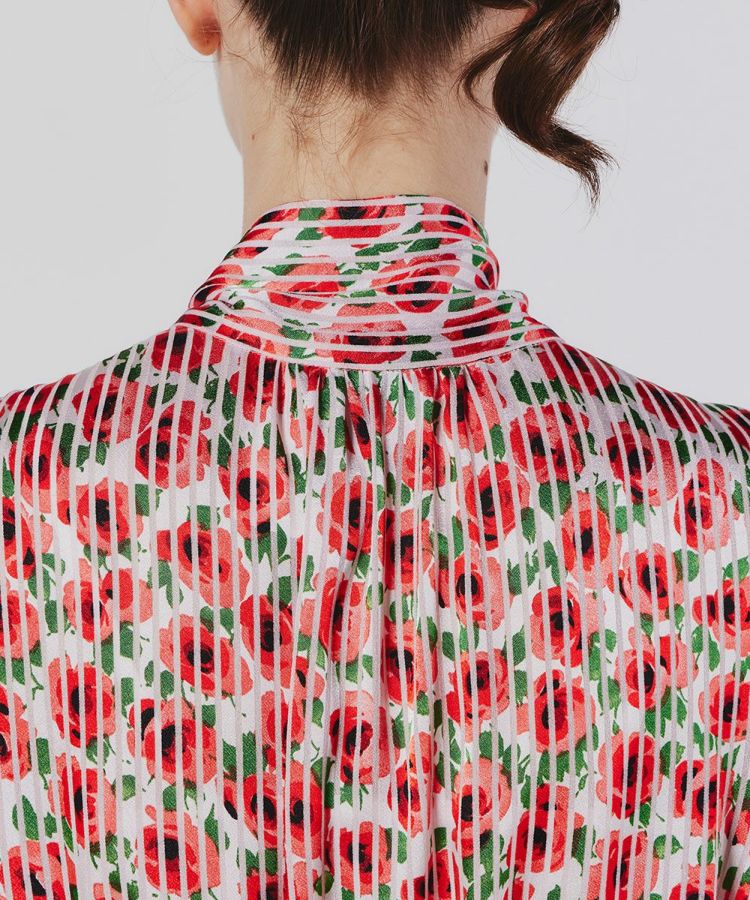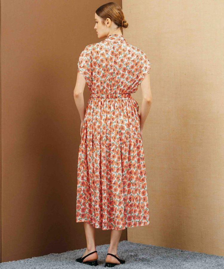 明るく可憐な印象を与えてくれる花柄のワンピース。白のストライプを重ねることで甘さを抑え、大人っぽく、スタイリッシュに仕上げています。また、ボウタイデザインがクラシカルなアクセントをプラス。一枚でこなれ感のある佇まいを叶えてくれます。腕のラインをきれいに見せてくれる絞りデザインの袖や、脚長効果が狙える高めの位置のウエストも密かなポイント。