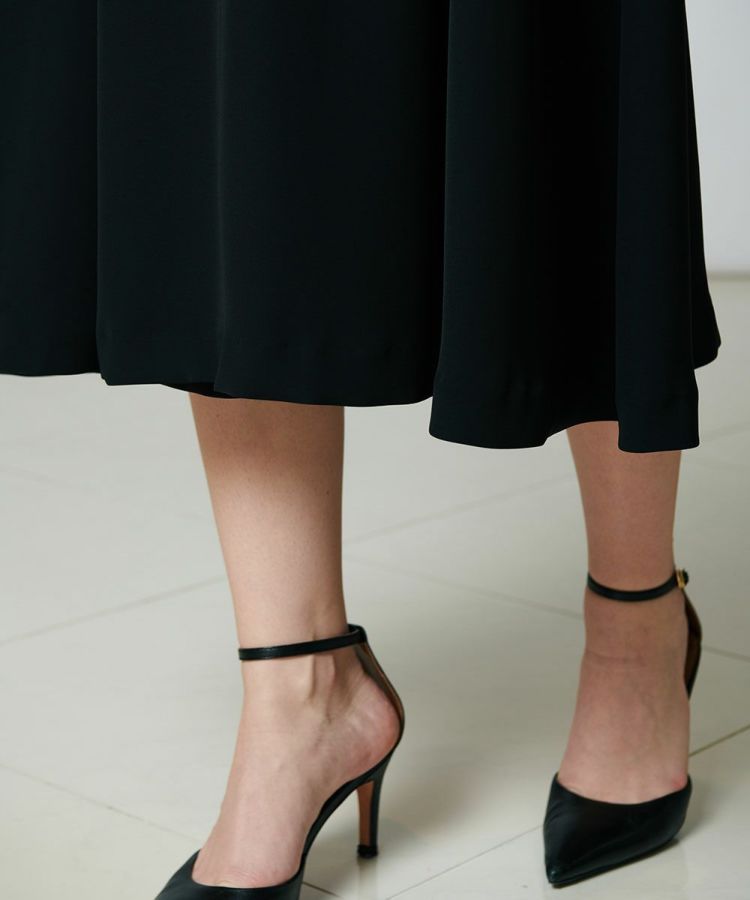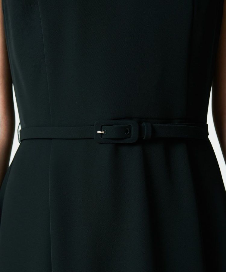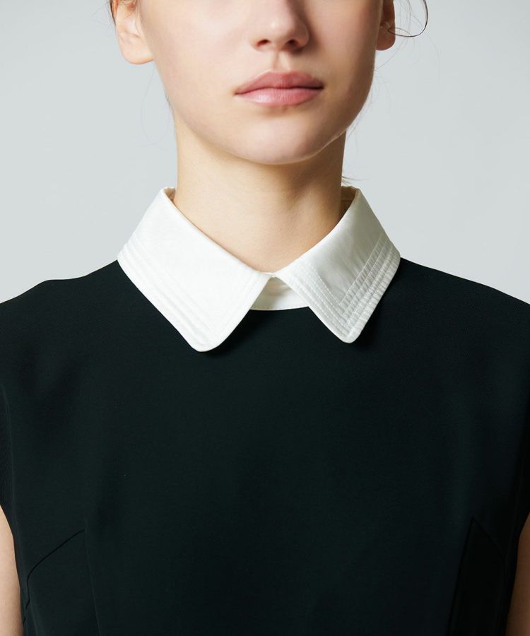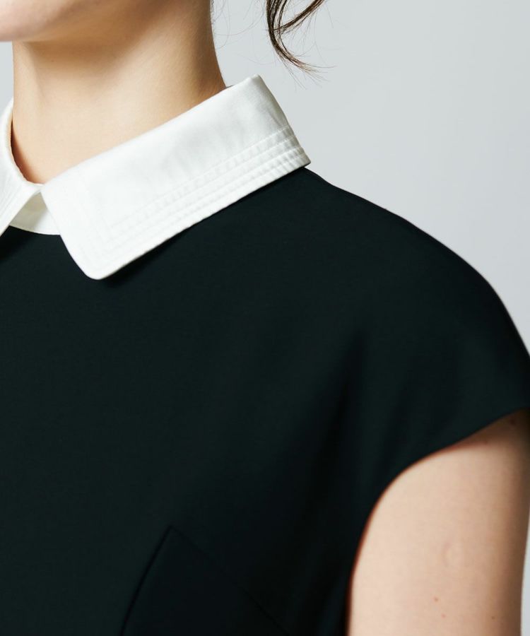 クラシカルで清楚な印象のワンピース。ブラックと白襟のバイカラーがきりりとした表情を引き立てる一方、フレンチスリーブが柔らかな腕のラインを演出し、女性らしさをプラスします。ウエストのベルトは高めの位置に設定することで、さりげなくスタイルアップ効果が。スカートにはしっかりとドレープがあり上品。また、ヒップラインが自然にカバーされるのもうれしいポイントです。