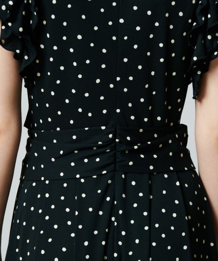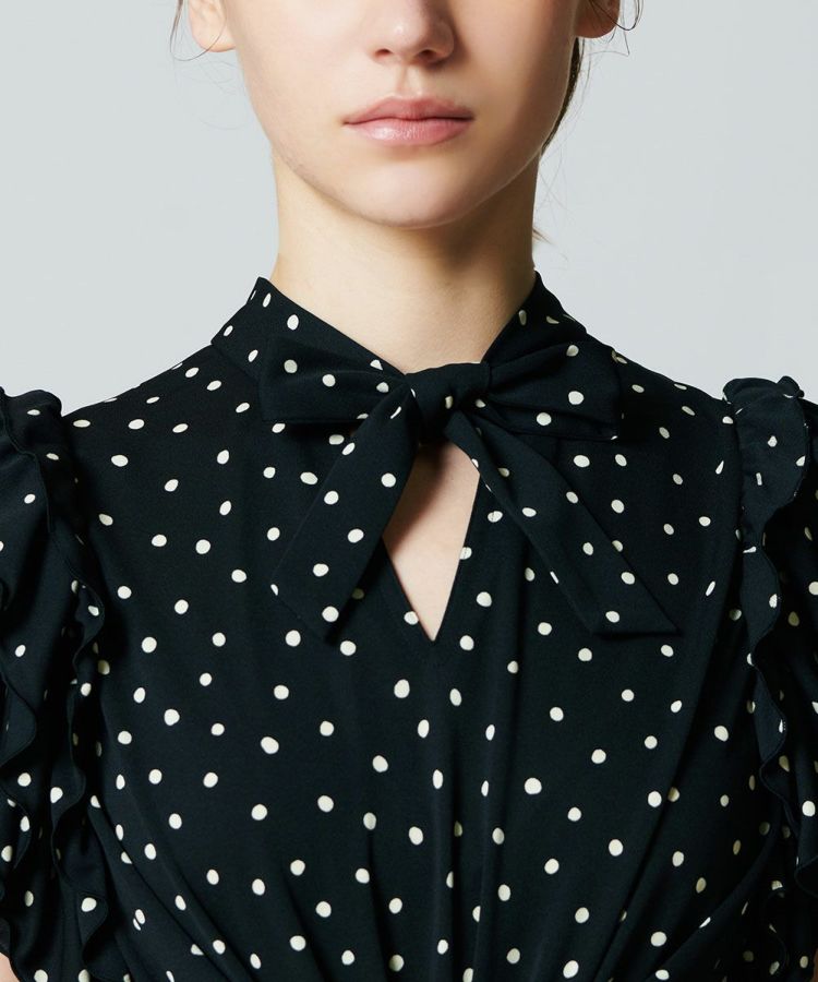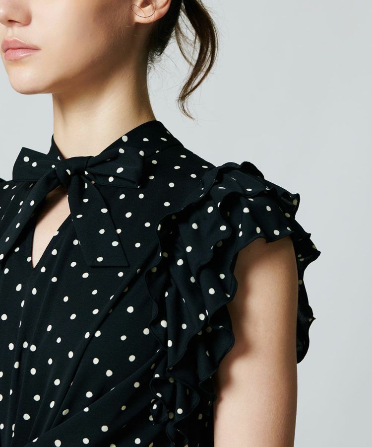 小さめのドットが大人かわいいワンピース。ボウタイがほんのりレトロでロマンチックな印象をプラスします。フェミニンなアクセントになったフリル袖は、腕のラインをきれいに見せてくれます。また、カシュクールのデザインもポイント。ウエストにメリハリを与え、スタイルアップ効果も抜群の一着です。