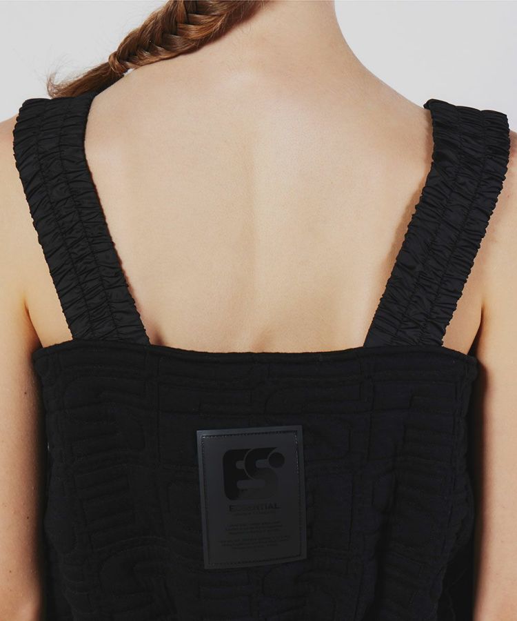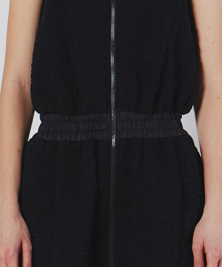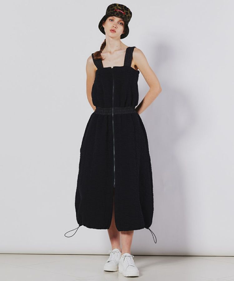 コンピューターキルトジャガード素材を使用した、ロング丈のワンピース。独特のふくらみ感とストレッチ性を兼ね備えたエッセンシャルオリジナルの素材で、重くなりがちな中綿を用いつつもワンピースらしく、着ぶくれしにくく軽やかに仕上げています。ウエストと肩紐にはタフタ素材のゴムギャザーを施しアクセントに。フロントのファスナーやスリットも抜け感たっぷりです。