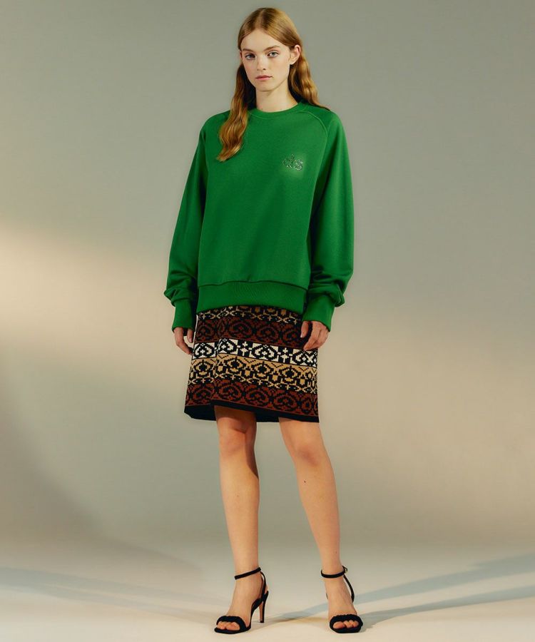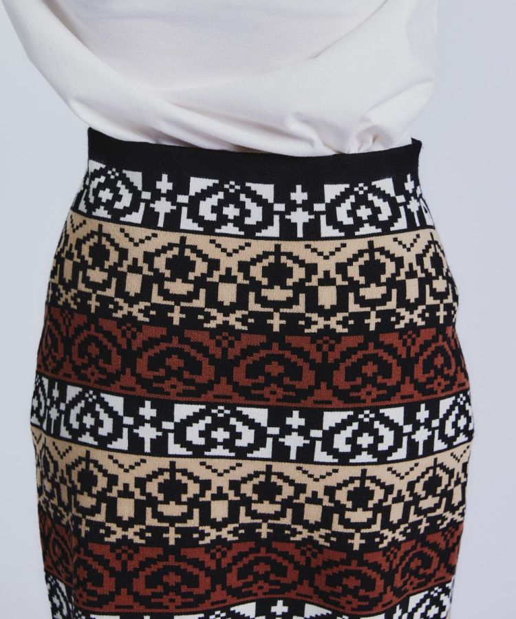 ダブスタ定番のSNOWY糸で編み上げた、ジャガードニットスカート。存在感あるジャガード柄は、シンプルなトップスと合わせるだけでおしゃれにきまります。ウエストや裾には黒無地ラインを配し、メリハリあるシルエットに仕上げました。また、ニット素材ならではの柔らかな穿き心地や、動きやすさも魅力。パンプスで上品に、スニーカーでカジュアルに着こなすのもおすすめです。