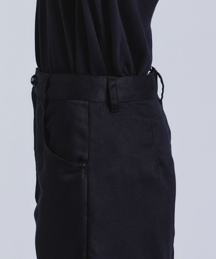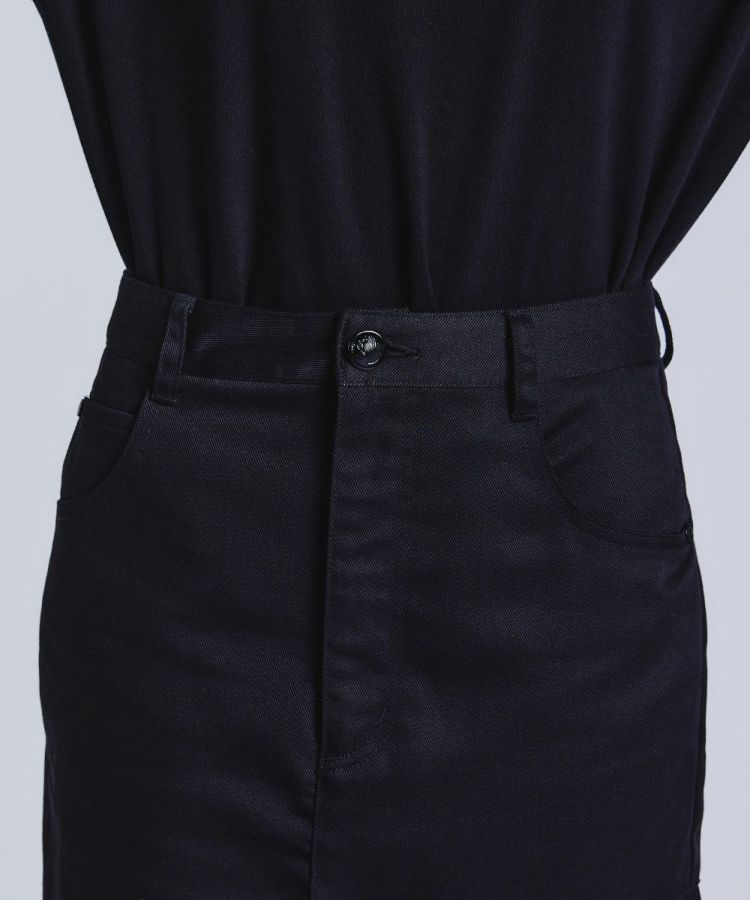 アシンメトリーな切り替えが目を惹くフレアスカート。ベーシックなカラーながらも、動きのあるシルエットと左右差のある丈がカジュアルの中に女性らしい印象を与えてくれます。素材は、オーガニックコットンとリサイクルポリエステルをMIXしたサスティナブル原料を使用。程よいハリ感と品のある光沢がポイントです。