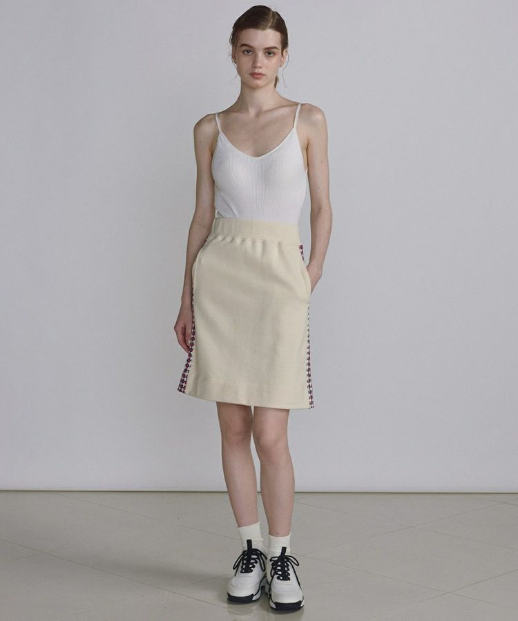コンパクトなシルエットのミニ丈スカート。グラフィカルなチェーン柄をサイドにあしらいポイントにしています。足がキレイに長く見える絶妙な丈感なので上品さがあり、新定番の大人ミニ丈としてチャレンジしやすいアイテム。ウエストはゴム仕様なので穿き心地は楽チンです。同柄の