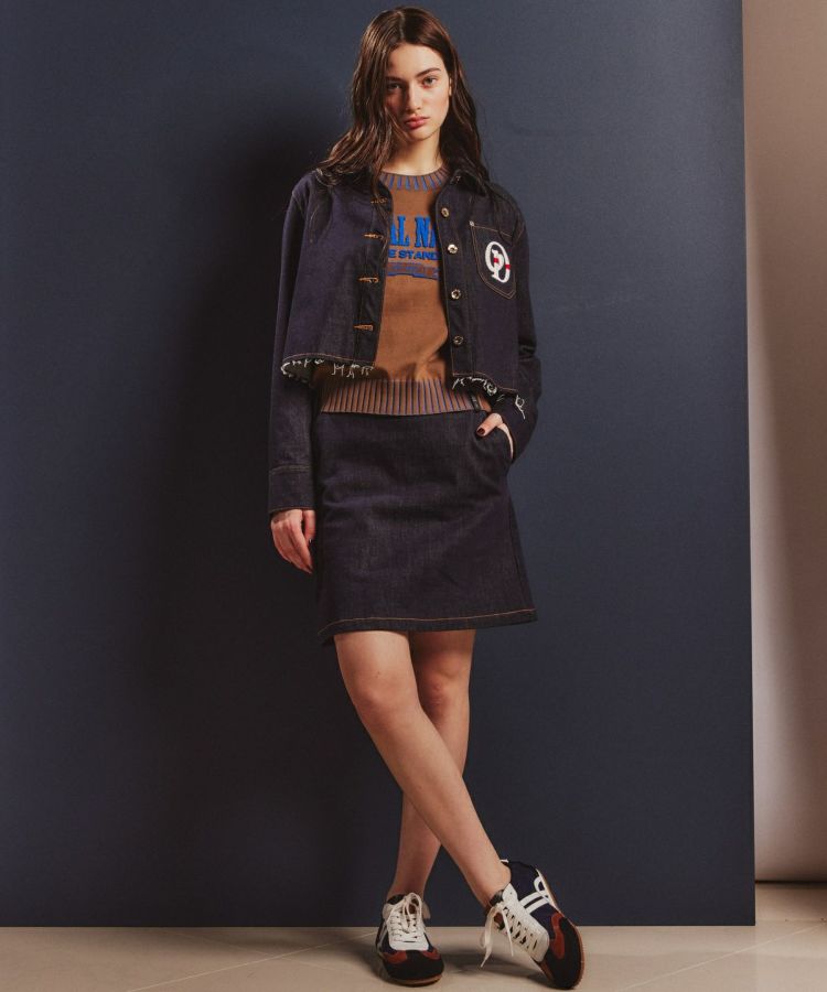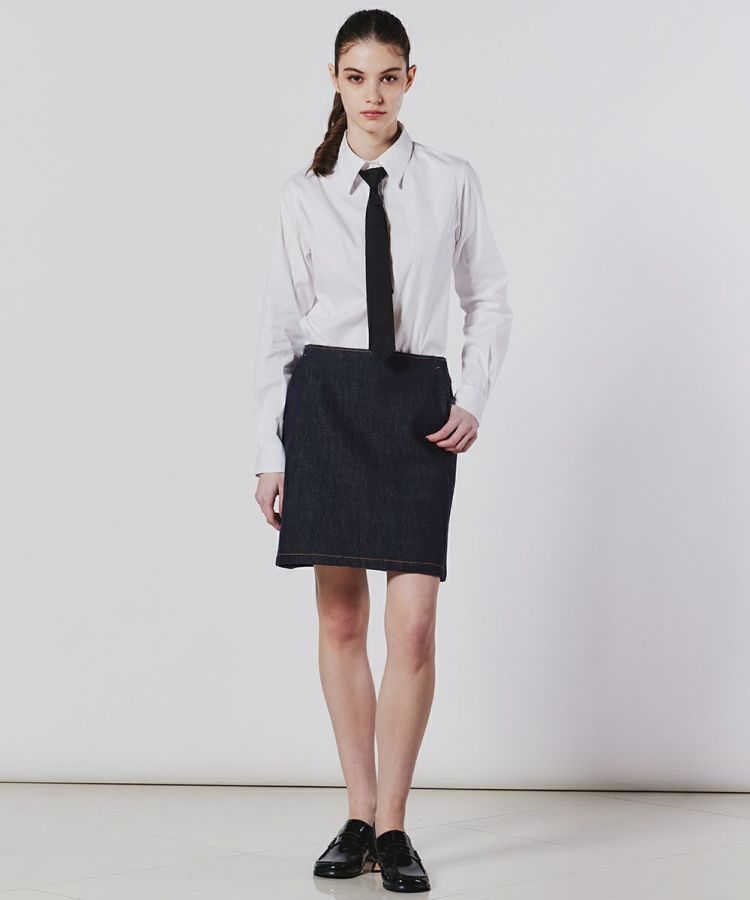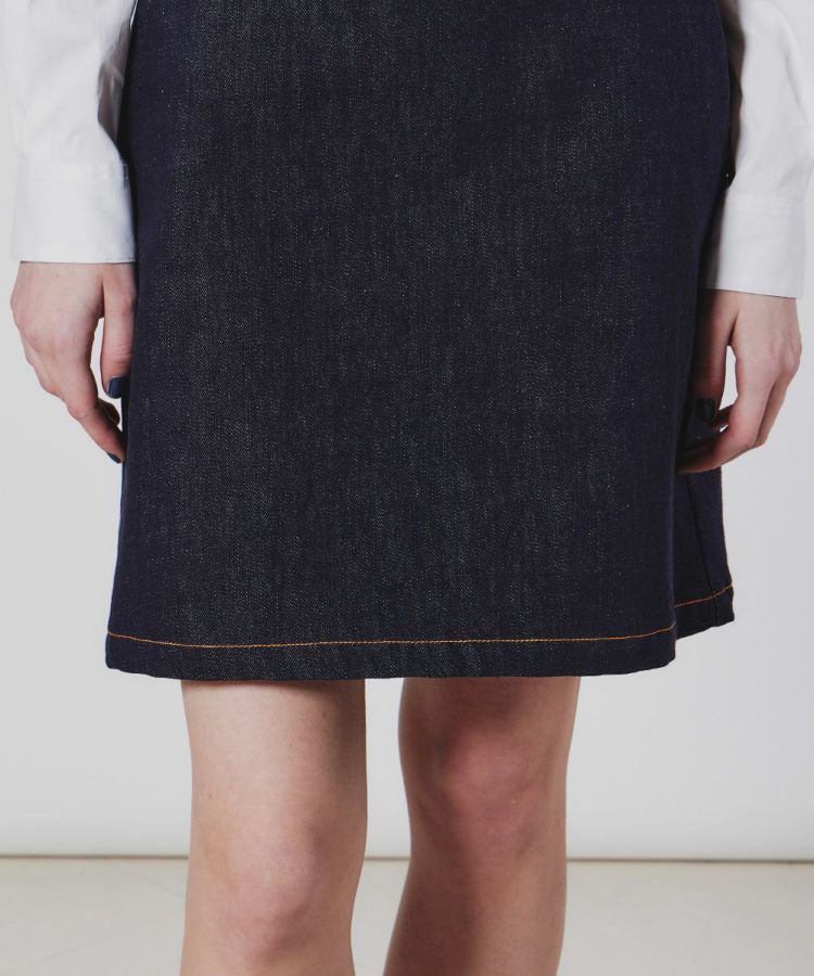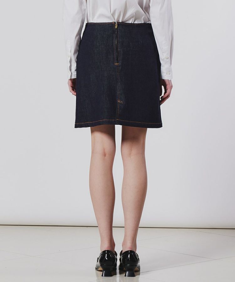 パリッとした生デニムの風合いがポイントになったミニスカート。前からはもちろん、横から見た時もきれいな台形シルエットになっているため、ハンサムな印象ながらも、女性らしい着こなしを叶えてくれます。ウエストは切り替えを作らす、すっきりとしたデザインに。トップスをインしても全身コーデが決まるのも魅力です。