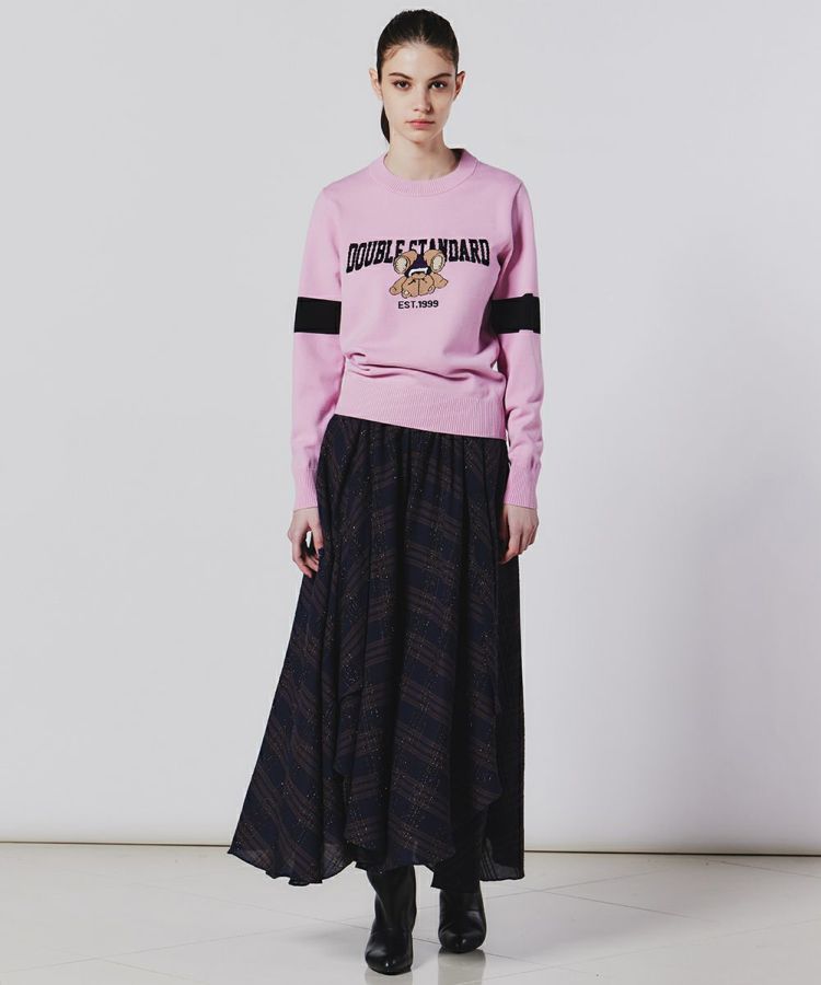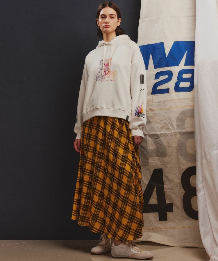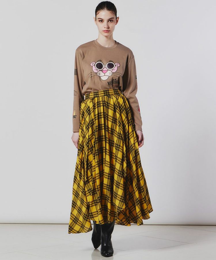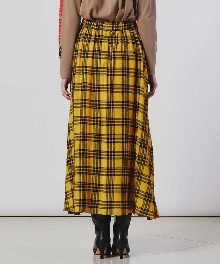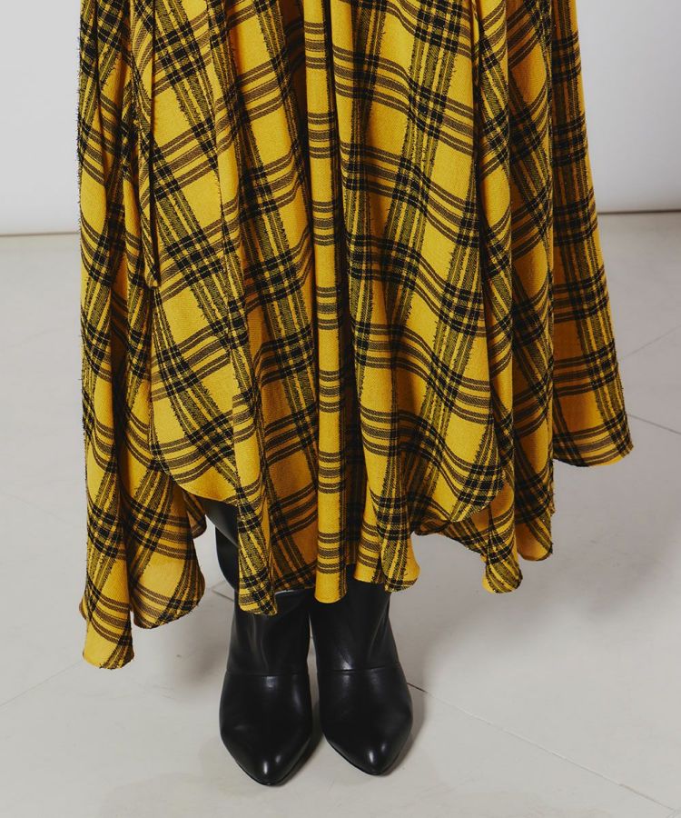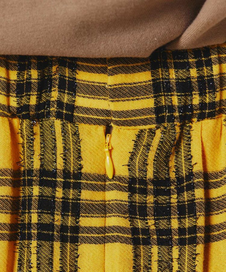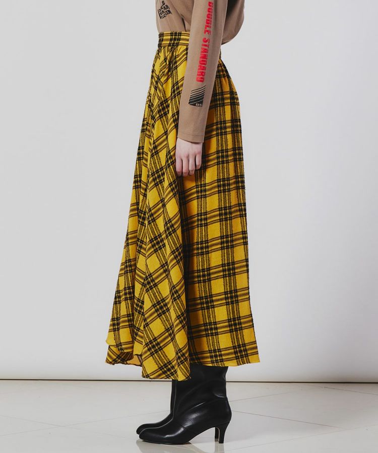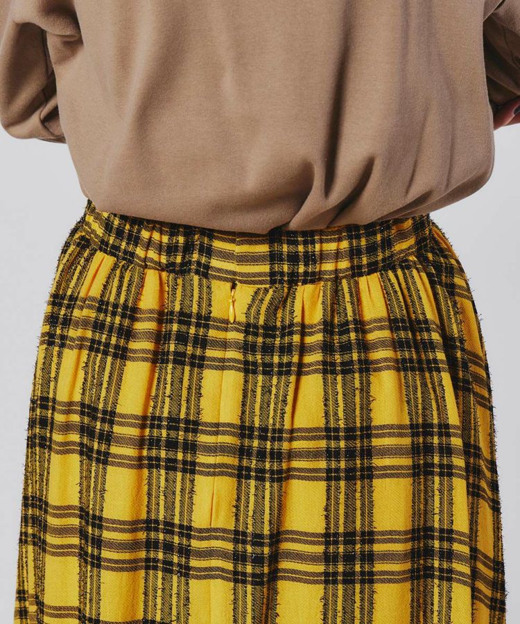 イタリアのLINEAESSE社の先染めチェック生地を使用した、フェミニンで秋冬らしい優雅が漂うフレアスカート。ヴィスコース混によるドレープ性、ウール混による程よい温かみ、モール糸による光沢感を兼ね備えています。軽やかな風合いがフレアシルエットにマッチし、歩くたびに美しさが映えるアイテムです。