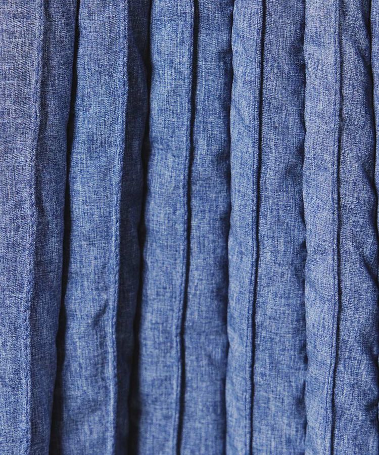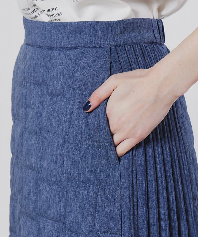 デニムライクなプリントを施した、タフタ生地のスカート。ステッチでプリーツのように見せるダブスタならではのイントレチャートのテクニックで、デザイン性のある一着に仕上げました。サイドはラインデザインで、スタイル良く見せてくれるのもうれしいポイント。これひとつでインパクトのあるコーディネートが完成するアイテムです。