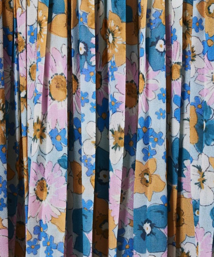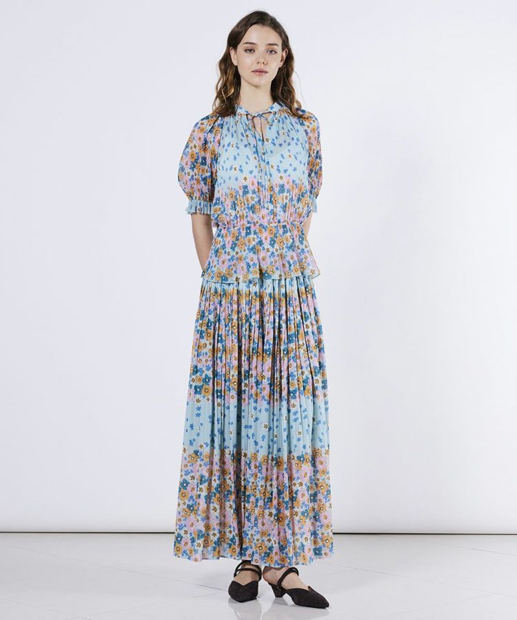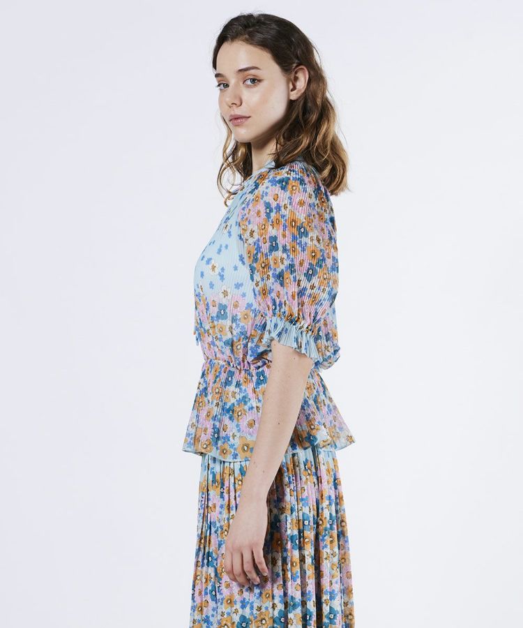 ノスタルジックなカラーリングが魅力のシフォンブラウス。鮮やかなフラワー柄に細やかで繊細なクリスタルプリーツを施し、動くたびに表情が生まれる上品な一枚に仕上げました。胸元はすっきりとしたスタンドネックに細めのリボンを組み合わせて女性らしいやわらかな印象に。同素材のスカート(型番:0202191253)とセットで着用すれば、レトロワンピースのような着こなしが完成します。