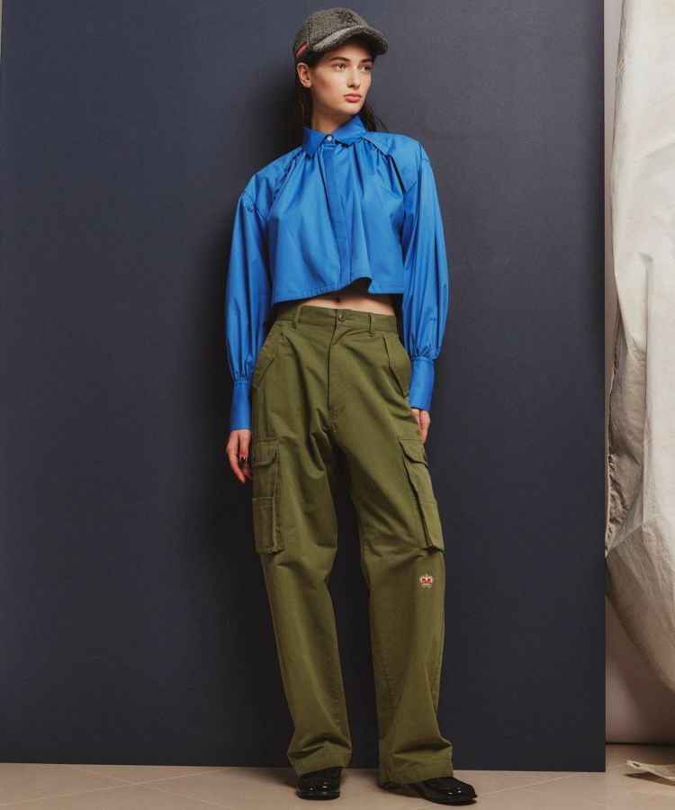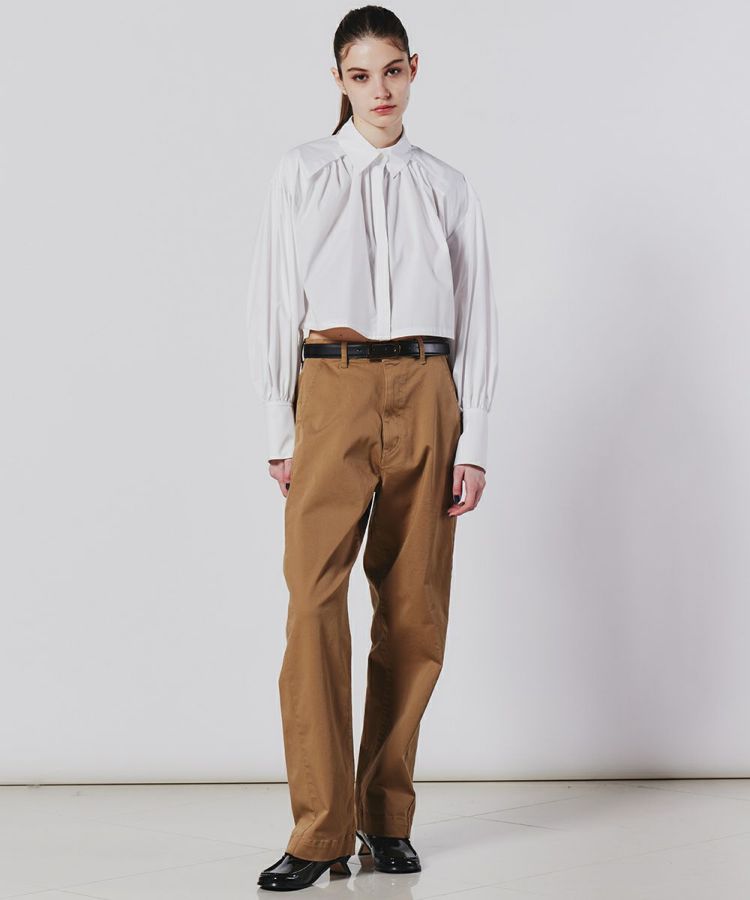 パリッとハンサムな印象を与える、ショート丈のブラウス。フロント、バック、スリーブにもたっぷりとギャザーを寄せ華やかさをプラスしました。また、大胆なショート丈にすることで、コーディネートがぐんとモードに。どんなボトムを合わせても全身がスタイルよく決まるのも魅力です。袖先をやや眺めに設定したり、裾をリボン仕様にするなど、さりげない甘さを潜ませているのもポイント。