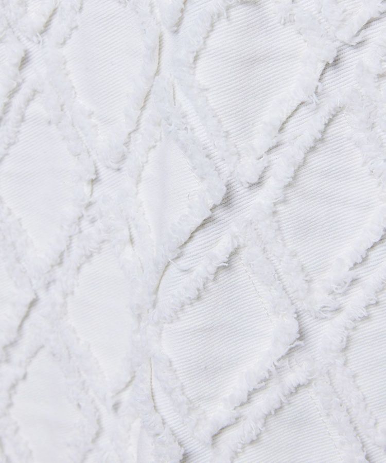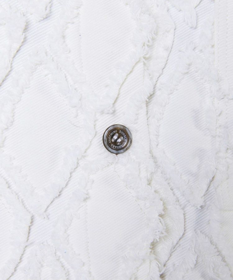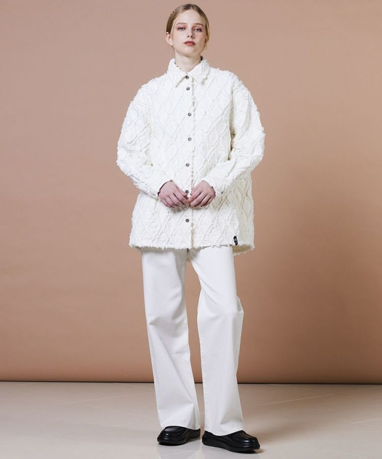 全面にあしらったダイヤ柄をフリンジで立体的に表現したデニムシャツ。柔らかい質感が女性らしい印象を演出してくれます。ほどよくゆとりのあるシルエットで、リラクシンな雰囲気をプラス。フェミニンからカジュアルまで、さまざまなコーディネートに活躍する万能なアイテムです。