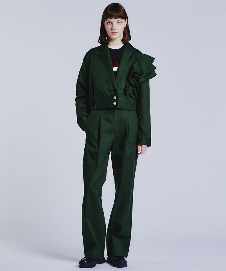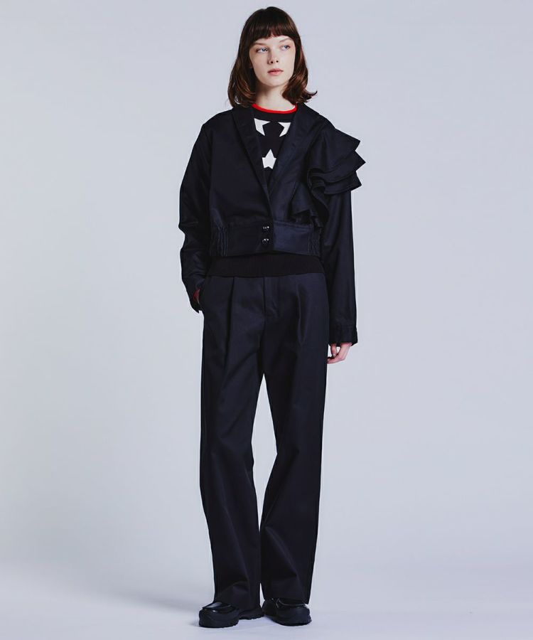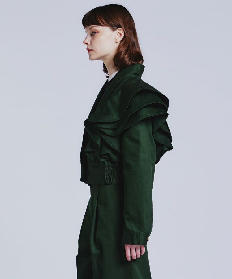 エッジの効いた着こなしを叶えてくれる、ショート丈のジャケット。左肩にフリルをあしらったアシンメトリーのデザインがポイントで、一枚で主役になるアイテムです。しっかりとしたウェイト感があるキャバリーツイル生地を使用しており、 柔らかな風合いと着心地の良さが魅力的。オリジナルボタンもポイントになり、カジュアルなコットン生地ながらもほんのりクラシカルなムードが効いています。