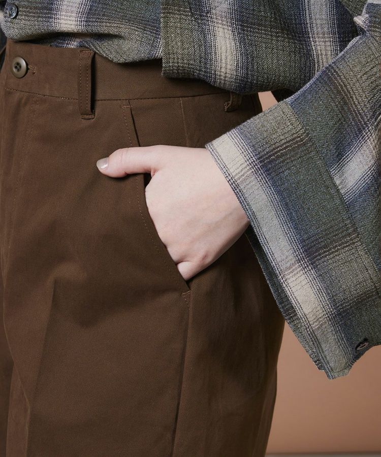 シンプルなデザインで、着回し力抜群のパンツ。ストレッチ性に優れたコットンストレッチピーチ素材を使用し、快適な履き心地を叶えました。美しい落ち感とセンタープレスが縦のラインを強調し、すっきりとしたシルエットを演出。トップスを選ばず合わせやすいため、ワードローブに一枚は持っておきたい万能アイテムです。