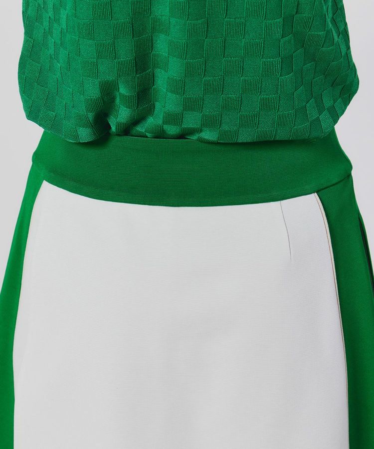 ストレッチ性に優れたヴィスニーポンチ生地を使ったミニスコート。サイドのラインがスポーティーな印象を与えるとともに、縦のラインを強調するためヒップラインをすっきり見せてくれるのがうれしいポイントです。ウエストは太めのラインデザインにすることで、メリハリをプラス。全身のバランスが決まりやすいのが魅力です。