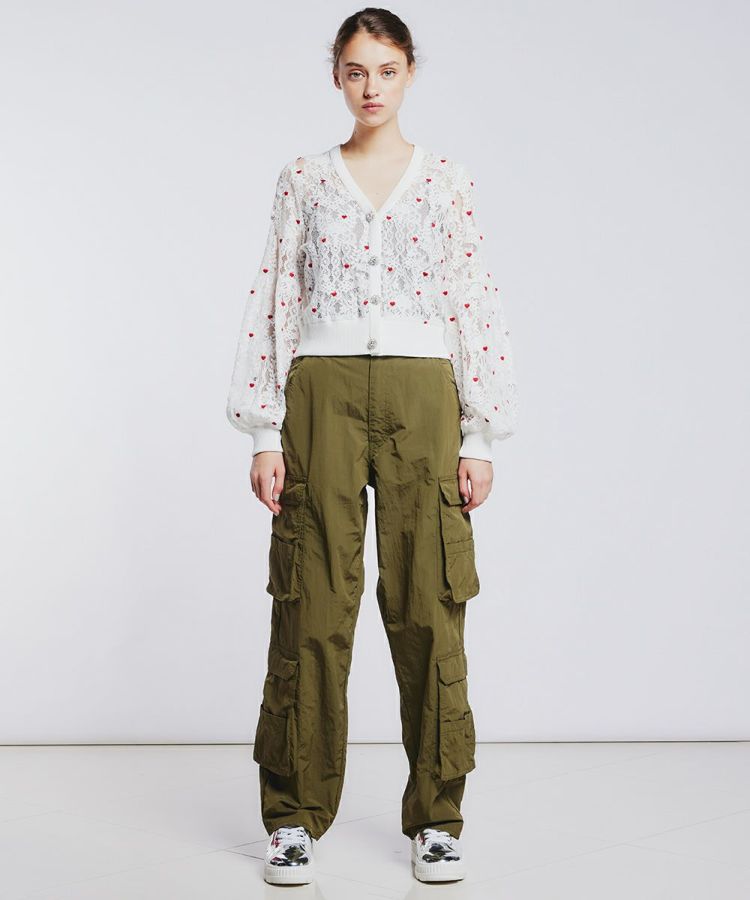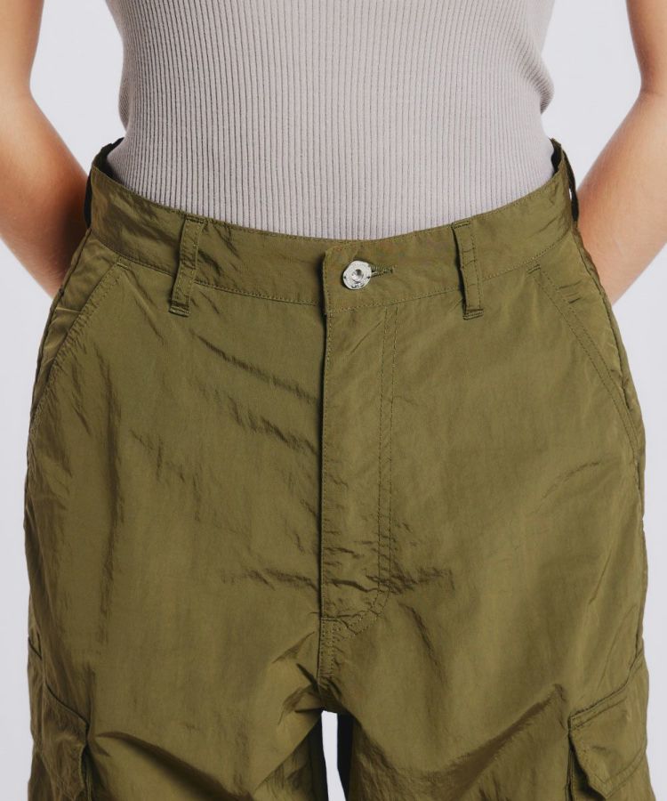 シャカシャカとした軽やかなタフタ生地で作ったカーゴパンツ。独特の光沢感があり、コーディネートのアクセントになるアイテムです。ウエスト位置は高めで、すっきりとしたウエストまわりに。程よいボリューム感でマニッシュになりすぎず、女性らしいトップスを合わせて甘辛コーデを楽しめるのも魅力です。