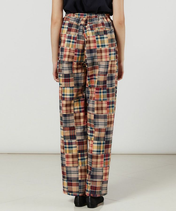 マドラスチェック柄をパッチワークにした、インパクトのあるパンツ。Tシャツに合わせるだけでコーデがサマになる程よいワイドシルエットで、着まわし力も抜群です。ウエストはボタンできちんと感がありながらも、バックはゴム仕様なので穿き心地楽チン。腰まわりやヒップラインをさりげなくカバーしてくれるのもうれしいポイントです。
