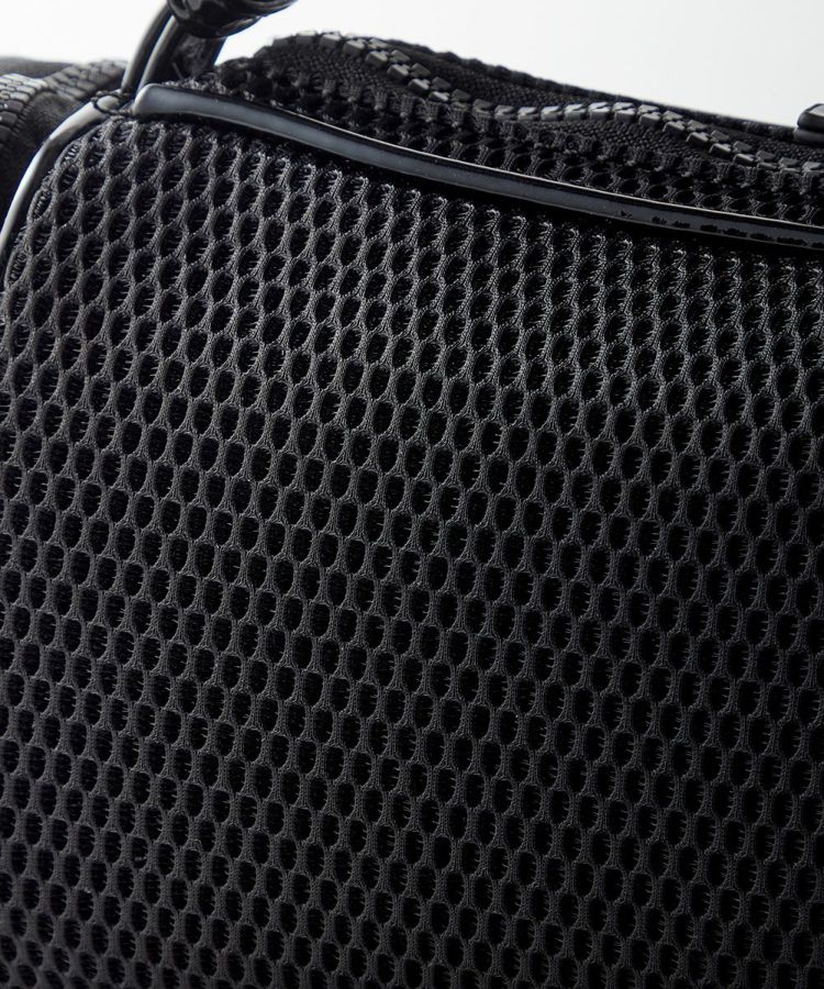 ユニークなボストン型とスポーティーなメッシュ素材を掛け合わせたミニバッグ。ハンドルや接続部など、パーツ部分はエナメル感を出しアクセントにしました。ブラックながらもデザイン性が高いため、手持ちした時にコーディネート全体をモダンに演出。カジュアルコーデはもちろん、キレイめコーデのハズしとしても活躍し、いろんな着こなしに合わせやすいのが魅力です。