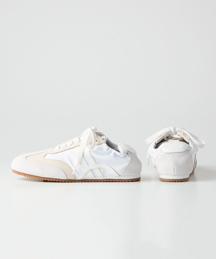 ヌバック、スエード、スムース、ポリ生地といった異素材を組み合わせた、上品なスニーカー。モノトーンカラーに仕上げ、しっとりと落ち着いたデザインに仕上げました。柔らかく作ったヒールカウンターもポイントで、履き口にもシャーリングをプラス。大人カジュアルなコーディネートに馴染む一足です。