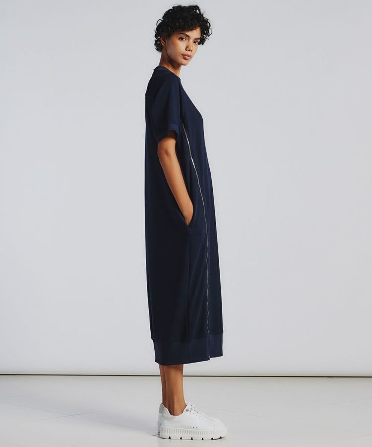 リサイクルポリエステルを使用した裏毛のワンピース。体型を拾わず、ゆったりとしたシルエットで着心地楽チンです。綿のようなナチュラルな風合いがありながらも、通気性は抜群。盛夏の一番暑い時期でも一枚で快適に着用できます。吸水速乾性と形態安定性に優れており、洗濯してもすぐ乾くのもうれしいポイント。裾まで続くサテンのパイピングコードがスタイリッシュで上品なアクセントになっています。
