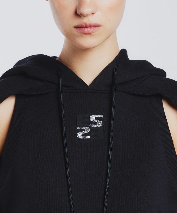 肩とバックにカットアウトのデザインが効いたフーディーワンピース。ボリュームのある袖や胸元のラインストーンもアクセントになり、カジュアルでも着映えのする一着です。表側にコットン、裏側にポリエステルを使用しているため、通常の裏毛より型崩れしにくいのもポイント。一枚できれめに着られる大人カジュアルなアイテムです。軽くて乾きやすいのも魅力で、イージーケアなのもうれしい!