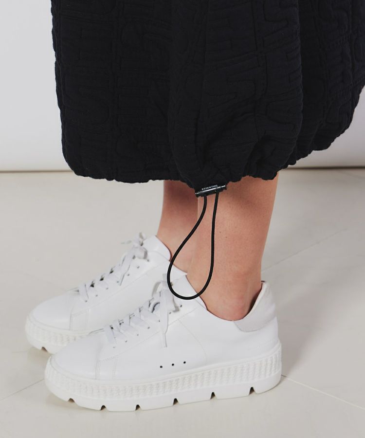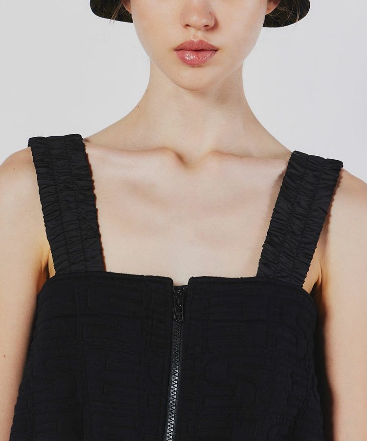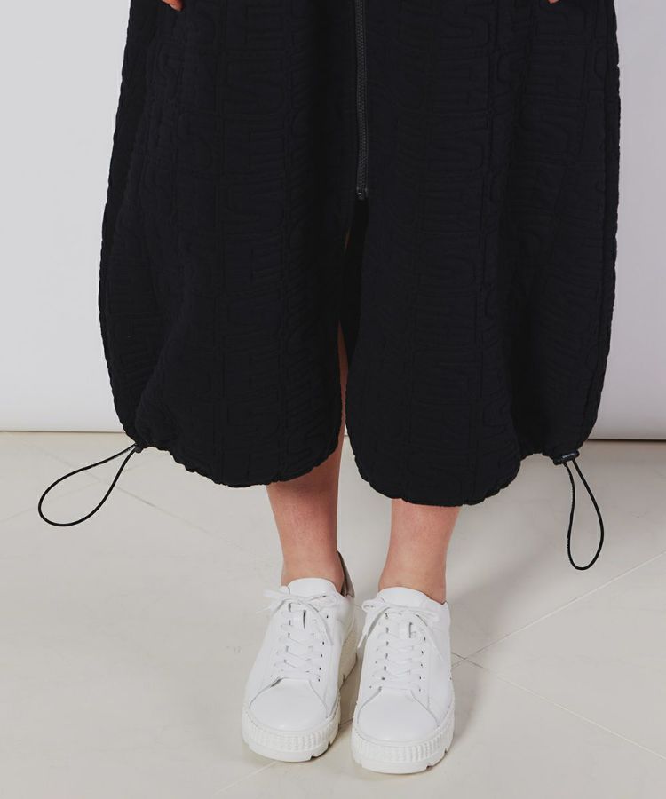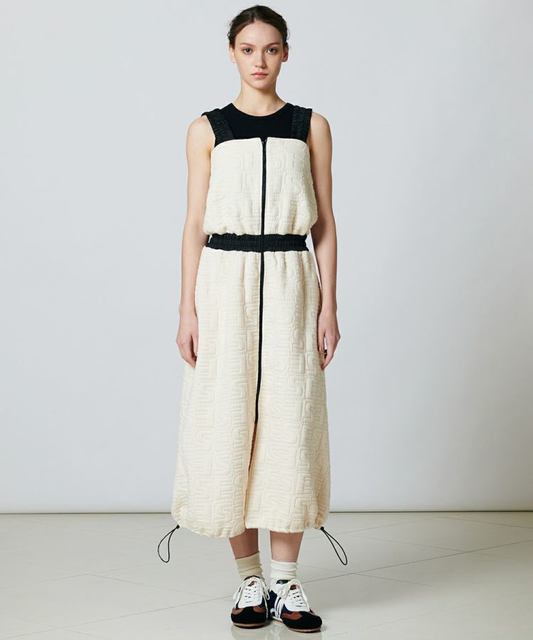 コンピューターキルトジャガード素材を使用した、ロング丈のワンピース。独特のふくらみ感とストレッチ性を兼ね備えたエッセンシャルオリジナルの素材で、重くなりがちな中綿を用いつつもワンピースらしく、着ぶくれしにくく軽やかに仕上げています。ウエストと肩紐にはタフタ素材のゴムギャザーを施しアクセントに。フロントのファスナーやスリットも抜け感たっぷりです。