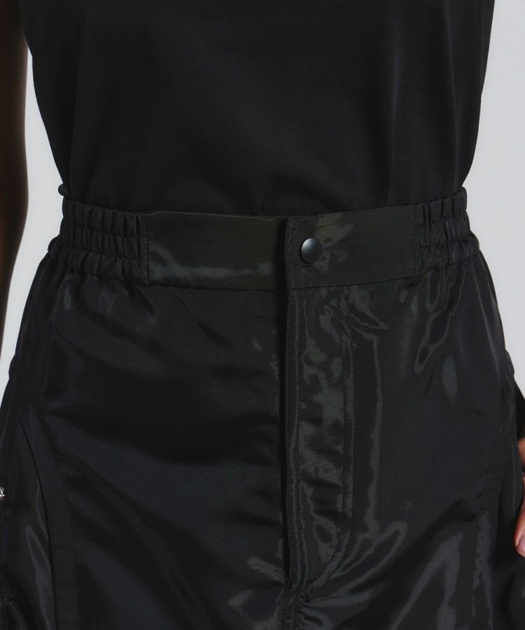 しっかりとしたハリ感と光沢感のあるタフタ生地を使用したフレアスカート。立体的なボックスポケットや切り替えラインがアクセントになり、エッジーな印象を与えます。ウエストはゴム仕様で穿き心地は抜群。長すぎないミドルレングスが着まわししやすく、さまざまなコーディネートで活躍します。