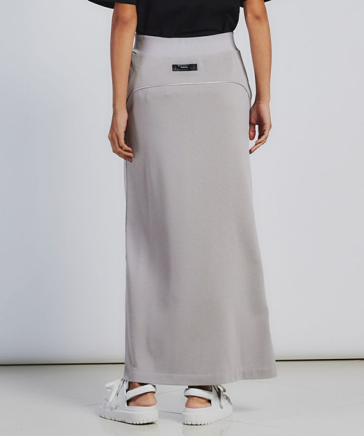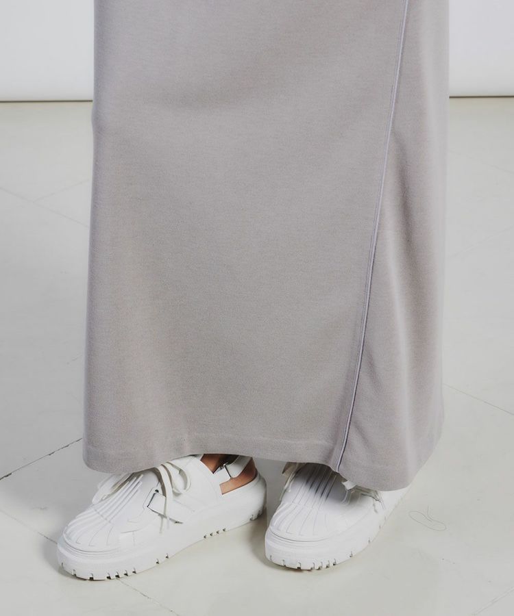 リサイクルポリエステルを使用した裏毛のロングスカート。綿のようなナチュラルな風合いがありながらも、ストレッチ性抜群。通気性が良く、涼やかで着心地抜群です。吸水速乾性と形態安定性に優れており、洗濯してもすぐ乾くのがうれしいポイント。サイドラインからのパイピングコードが太ももまわりやヒップラインをすっきりと見せてくれます。