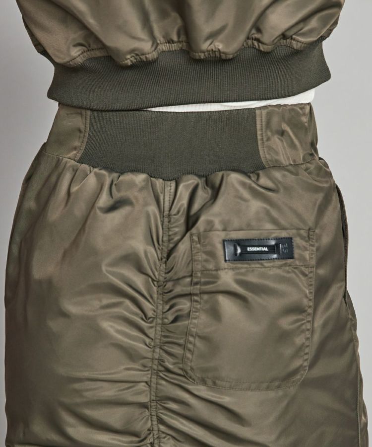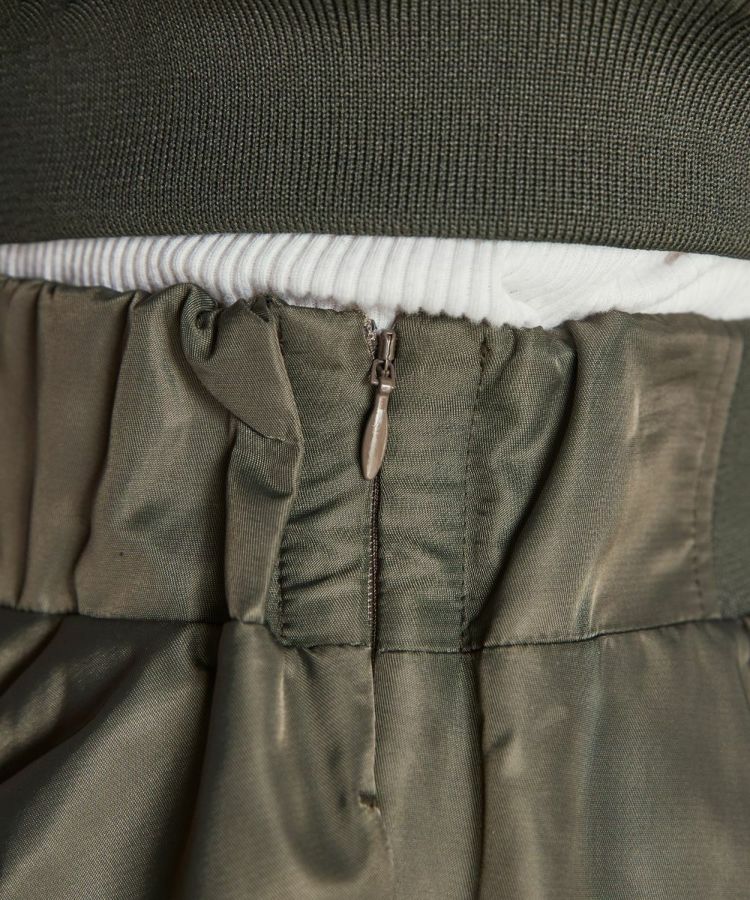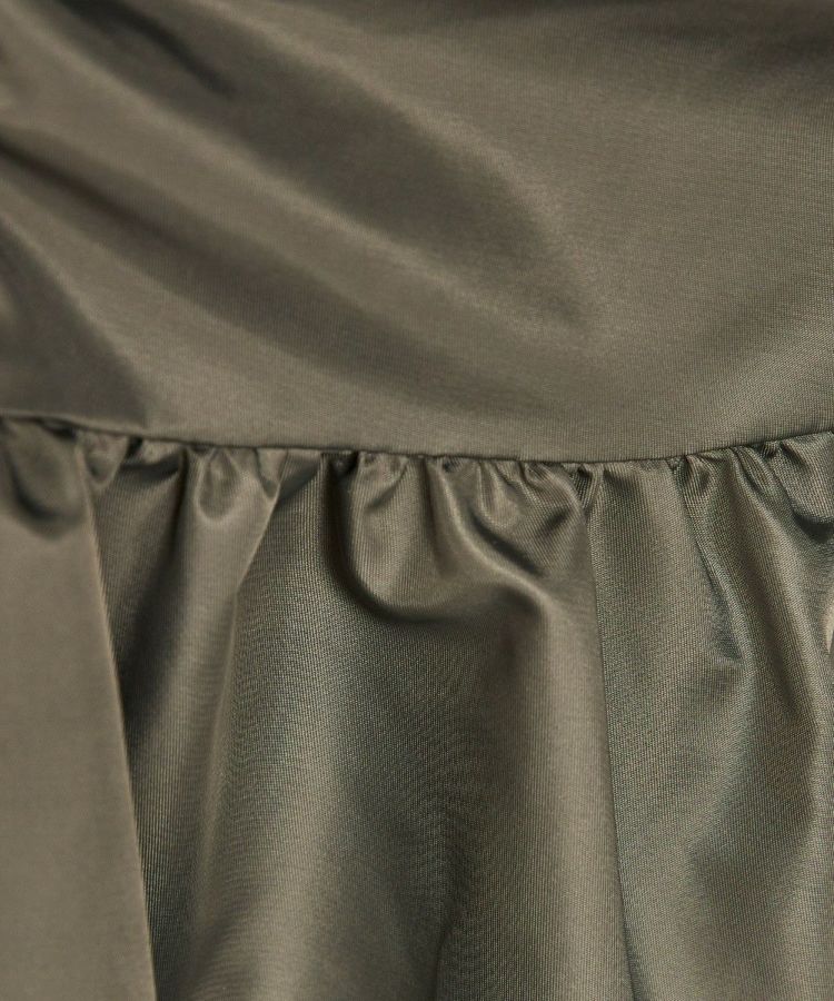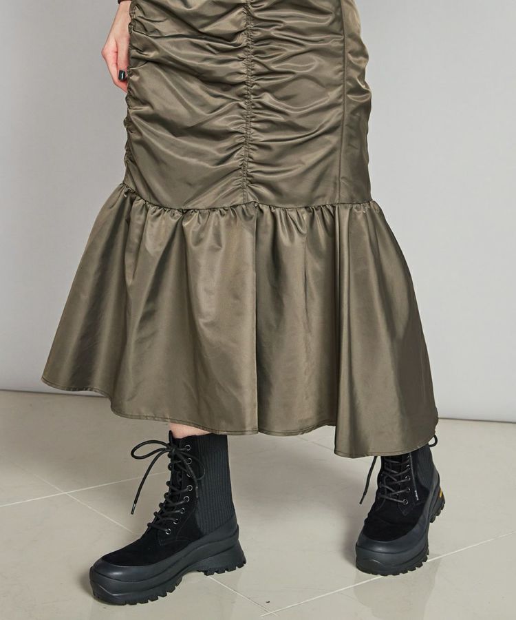 光沢感があり、程よい厚みと柔らかさが特徴のナイロンツイル生地で作ったマーメイドスカート。ハードな印象になりやすいアイテムですが、切り替えを利用してギャザーをたっぷりと入れることで、シンプルなトップスと合わせても女性らしく仕上がります。ウエストは後ろゴム仕様で、イージーな穿き心地なのもうれしいポイント。