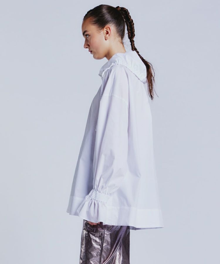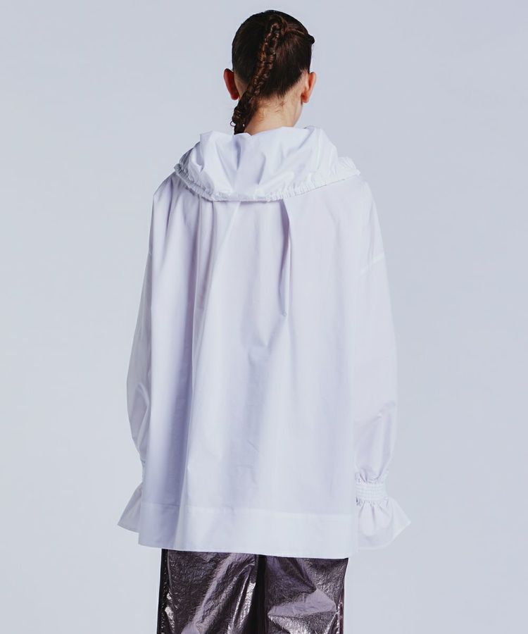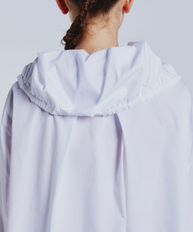 パリッとした質感が爽やかなタイプライター生地を使用したトップス。フードが襟になり、シンプルな中にアクセントを加えています。手元をきれいに見せてくれる、絞りを効かせた袖先もポイント。チュニック丈なのでウエストやヒップラインを自然にカバーしてくれるのもうれしいポイント。春先まで使える一枚です。