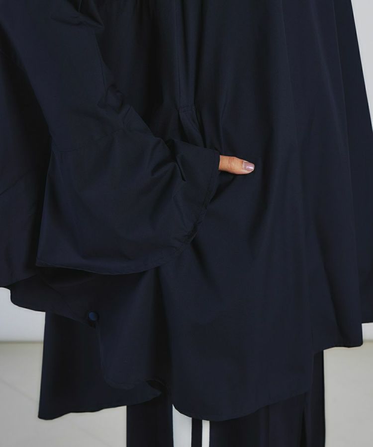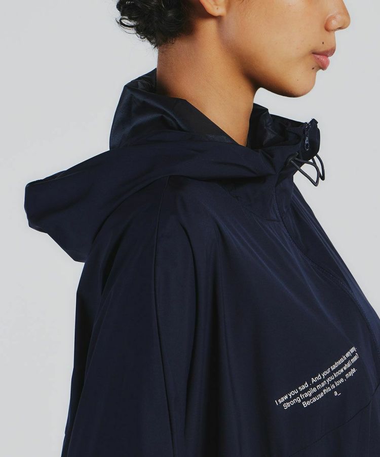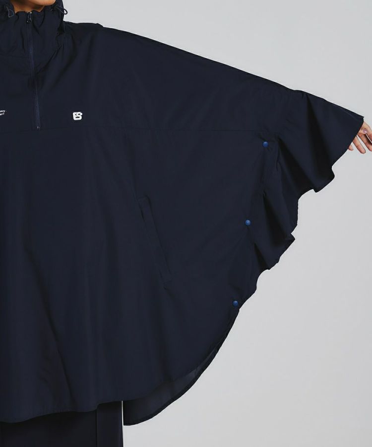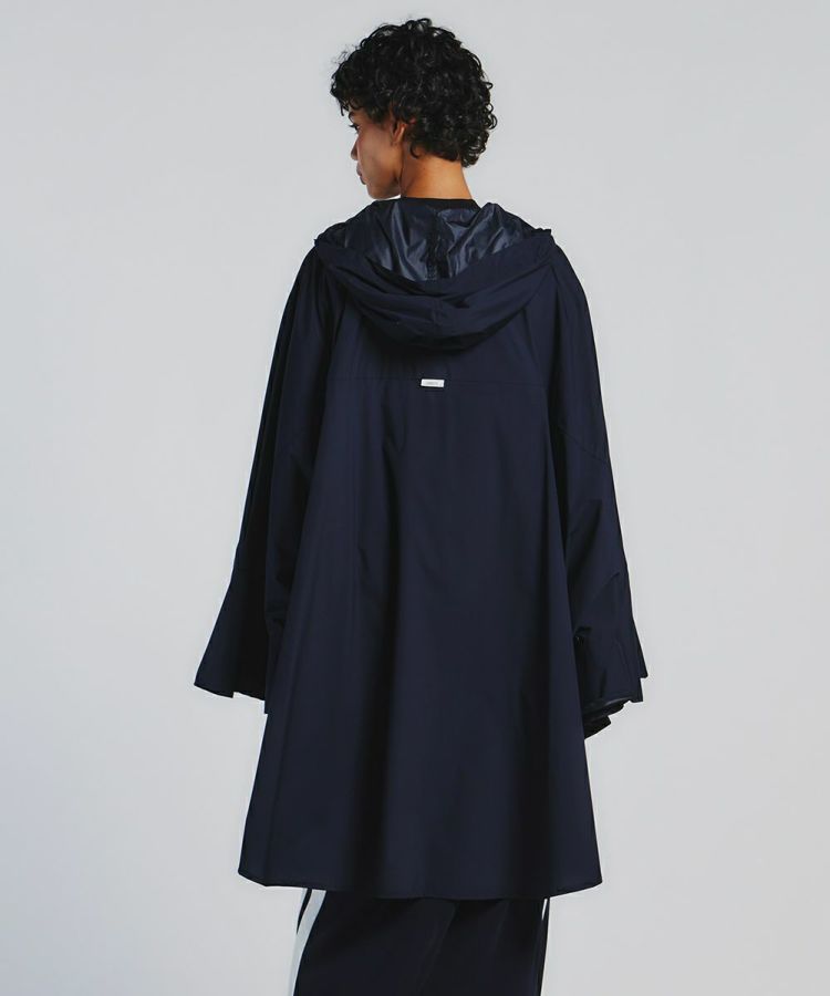 どんなコーディネートにも合わせやすい、ポンチョタイプのレインコート。スタイリッシュなデザインと軽やかな生地で、雨の日はもちろん、晴れの日にも着用できます。生地にはバイメタル構造のナイロン糸を使用しストレッチ性を出したタフタ素材を使用。ポリウレタンを使用しないことで液汚染を軽減し、防風・撥水性を実現しました。背中のポケットにたたんで収納可能なポケッタブル仕様。