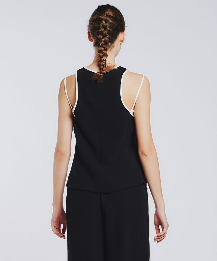 メインになるブラックの生地と、柔らかなピンク色の生地がレイヤードになったトップス。シンプルになりがちな春夏のコーディネートにひとつプラスするだけで、ぐんとこなれ感が出る優れものです。脇のラインを自然にカバーしてくれるのもうれしいポイント。ラインのデザインがさりげなくスポーティーな印象を与え、カジュアルなアイテムとも好相性です。同素材のボトムとセットアップを楽しむのもおすすめ。