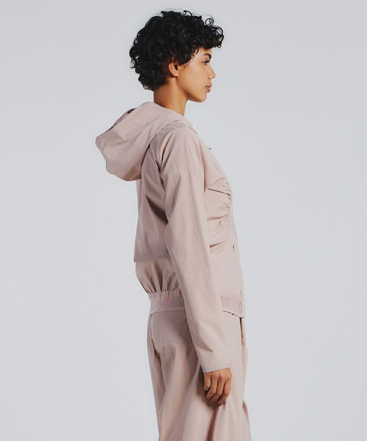 シャカシャカとした素材が涼しげでスポーティーな印象を与えるジップアップパーカー。ストレッチ性に優れているため、デイリースタイルはもちろん、アクティブシーンでも活躍します。サイドやバックの絞りデザインがポイントになり、シルエットをきれいに演出してくれるのが魅力的。胸元やバックにあしらったロゴもアクセントになっています。