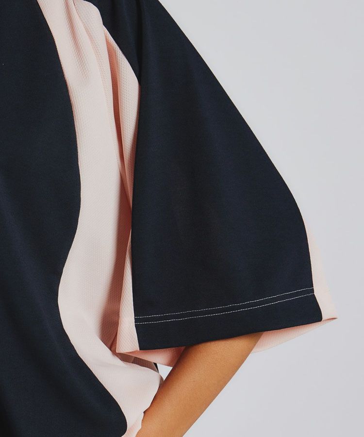 着心地の良い天竺素材で作ったTシャツ。サッカーTシャツを意識したバイカラーがトレンドライクです。メッシュ素材のコンビネーションが涼しげな抜け感をプラス。Vネックやラグランスリーブの切り替えはさりげない華奢見えを叶えてくれます。ゆったりとしたシルエットと大胆なバックプリントがカジュアルでありながら、上品な配色と美シルエットで大人っぽさも兼ね備えた一枚です。