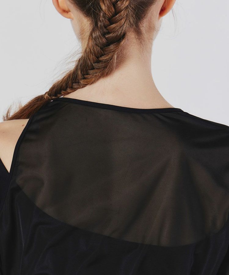 パンツでおなじみのメリルハイテンション素材を使用した新感覚トップス。さらっと肌になじむ質感の接触冷感に加え、紫外線防止、高反発ストレッチのアクティブサポート機能を搭載。まだまだ暑さの残る秋のおでかけにもぴったりです。透け感のあるトリコット素材をレイヤードすることで、異素材のコントラストが楽しめるデザイン性豊かな一枚。