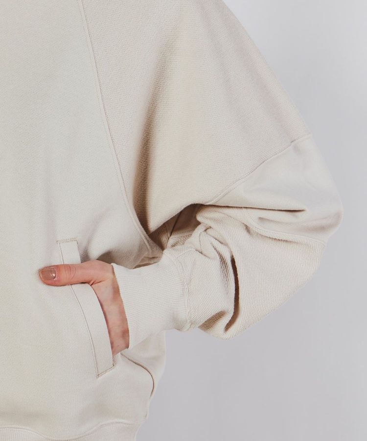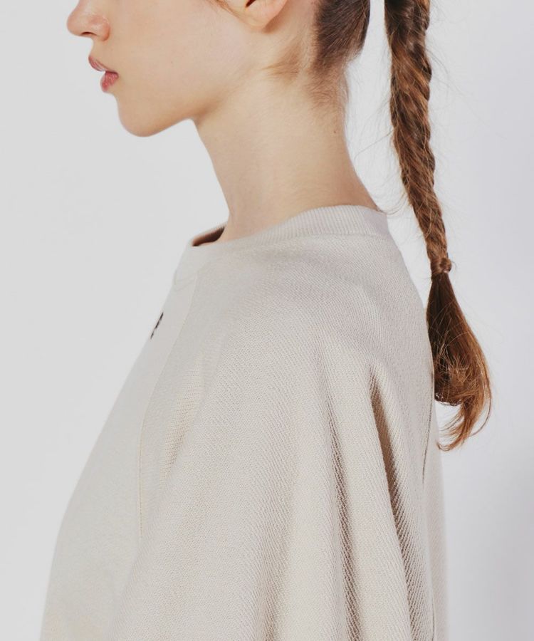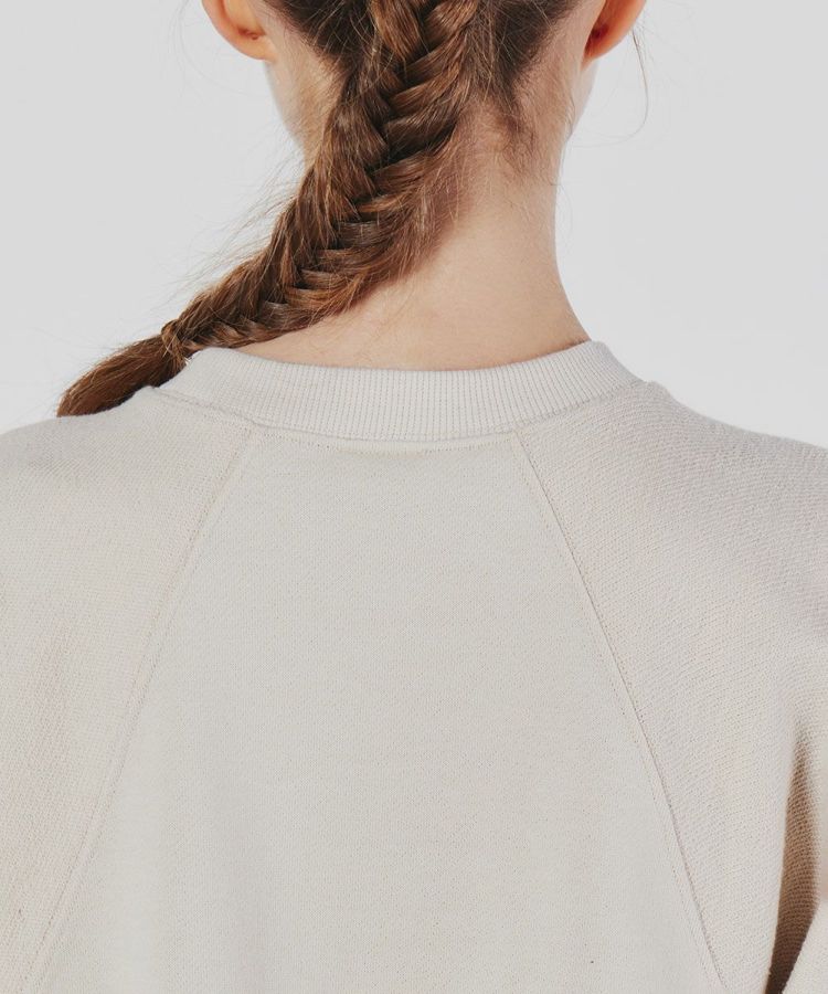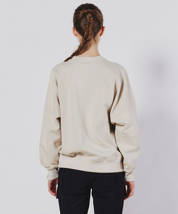 ラグランスリーブでラフなムードながらも、クリアな目面とハリのある質感できれいめに着られるスウェットトップス。程よい厚さで、晩夏から楽しめる一枚です。スリーブに切り替えを施すことで、横から見た時のシルエットもきれいに演出。ワンポイントの刺繍もアクセントになっています。