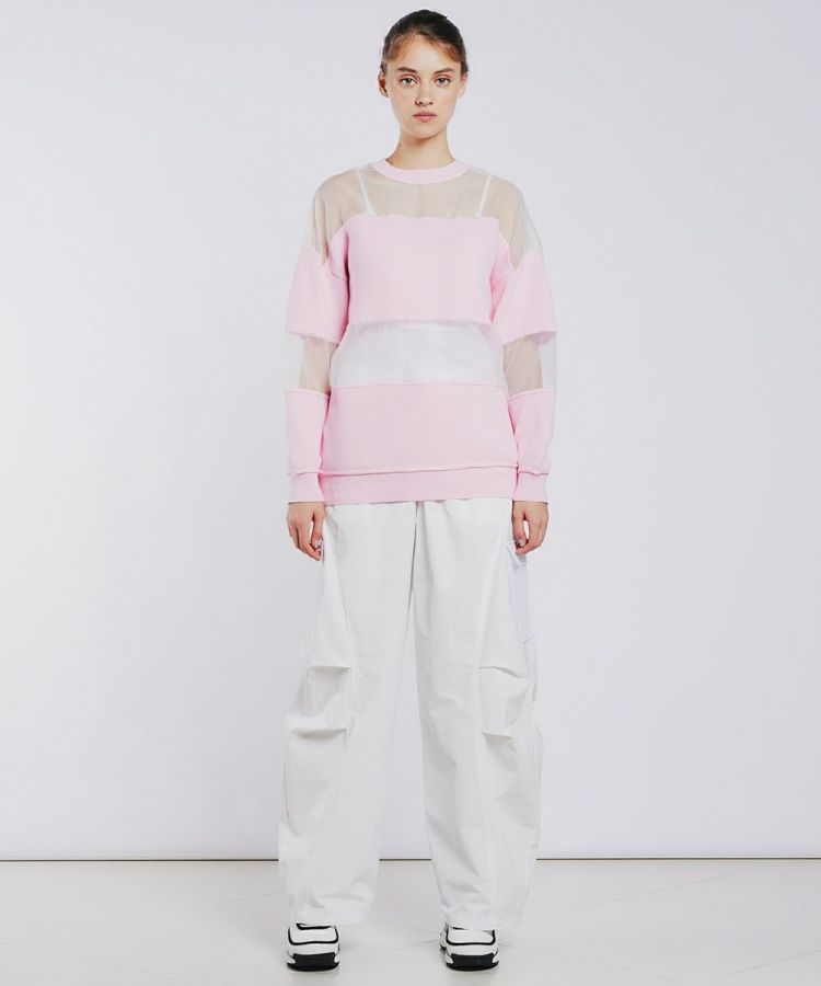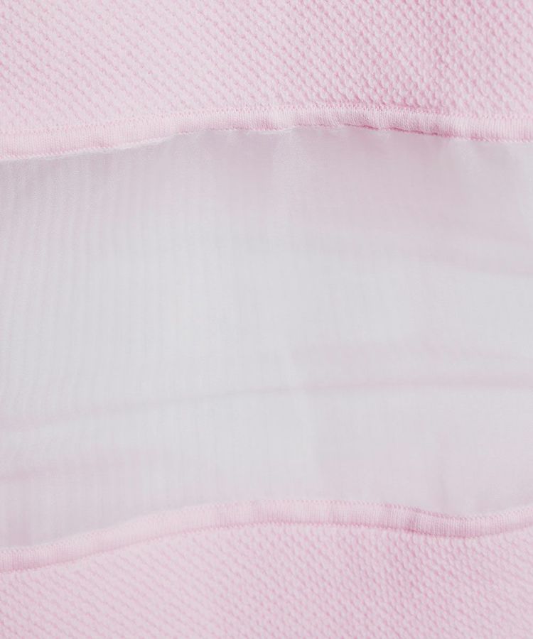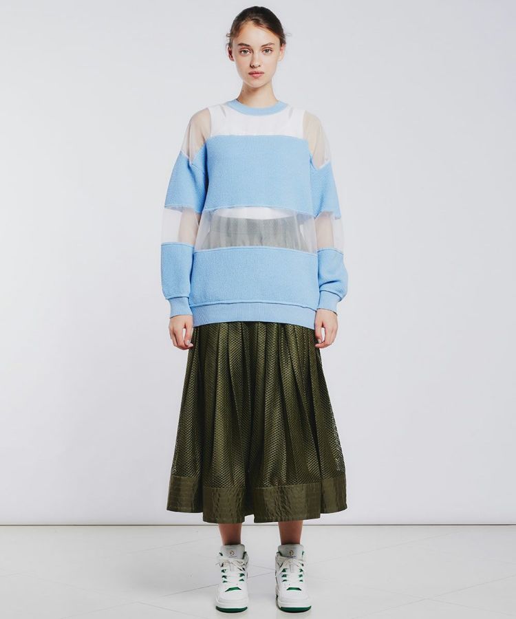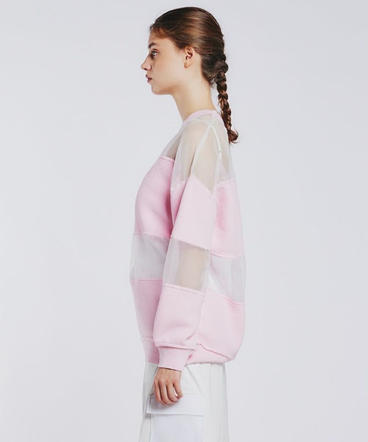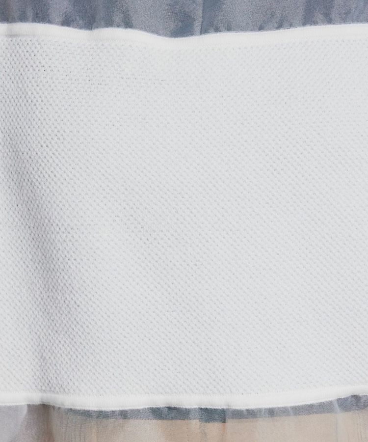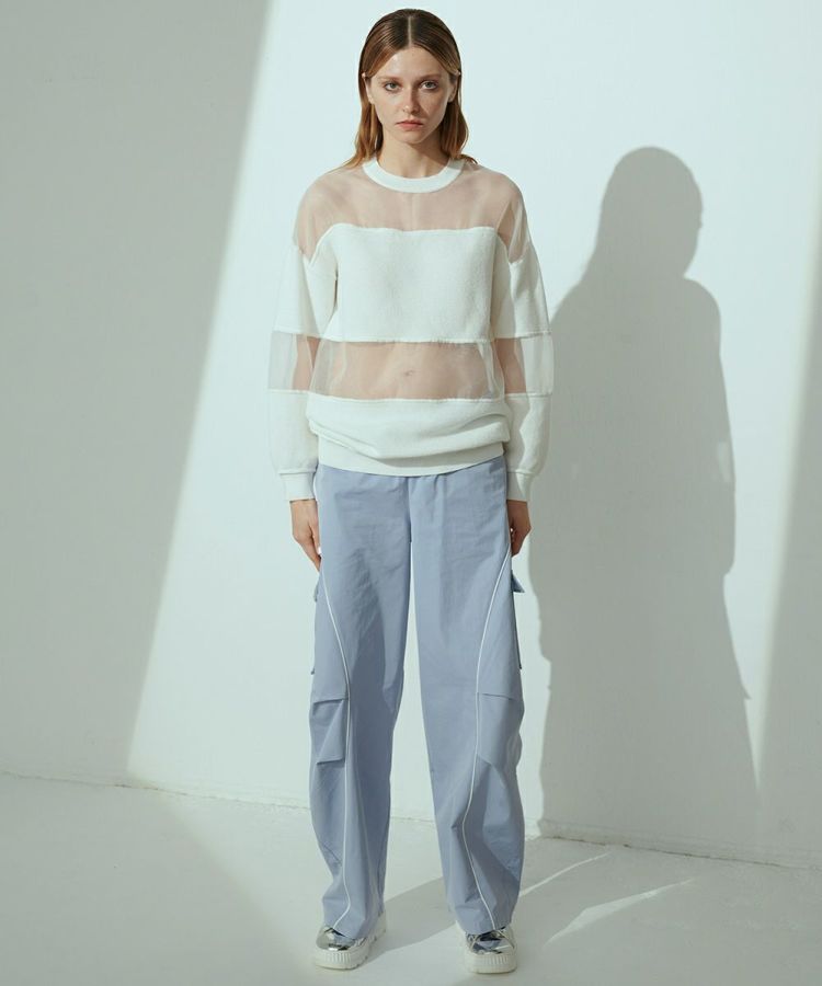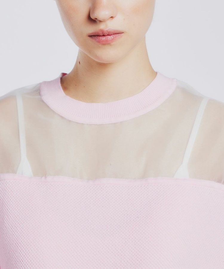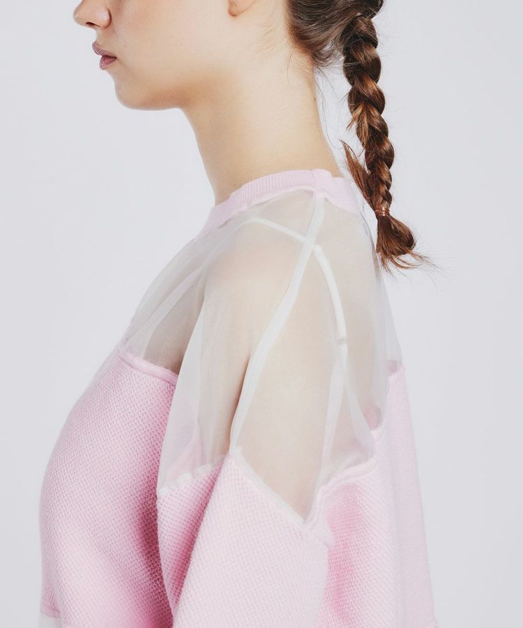 ボーダーになったニット生地と、上品な透け感がのオーガンジー生地がドッキングしたプルオーバー。これ一枚で春夏のレイヤードスタイルが叶う優れものです。カジュアルでありながらセンシュアルなムードがあり、インナーやボトム次第でいろんな肌見せを楽しめます。二の腕を自然にカバーしてくれるのもうれしいポイント。