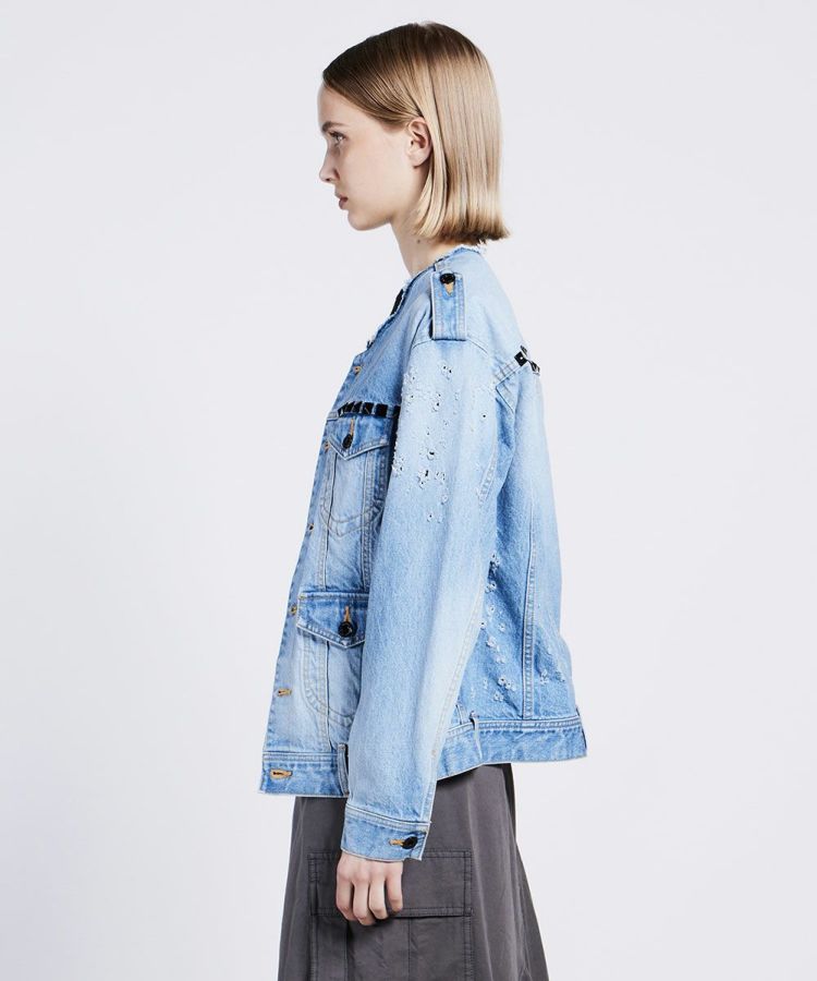 ノーカラーでラフに羽織れるデニムジャケット。ブラックのボタンやスタッズを施し、エッジーに仕上げました。袖や肩などのショットガンクラッシュ加工もこだわりのポイント。コンパクトなシルエットで女性らしく着られる一枚でありながら、コーディネートにインパクトを与えてくれるダブスタらしいアイテムです。