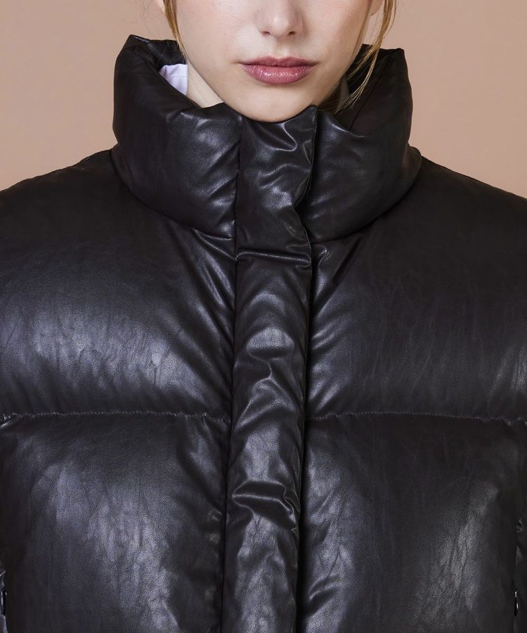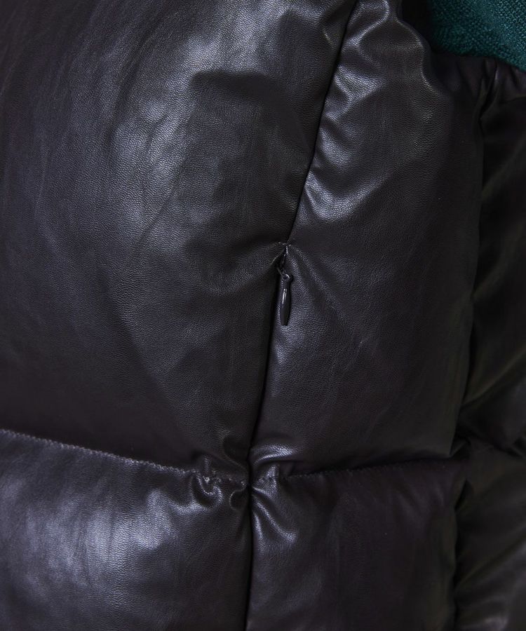 シックな雰囲気漂うフェイクレザーを使用したダウンベスト。たっぷりとフェザーを詰め込むことで、優れた保温性を実現しました。ボリューム感がありながらも、クロップド丈のコンパクトなシルエットでカジュアルすぎずきれいめな印象に。スラックスやロングスカートなど合わせるとバランスよくまとまります。